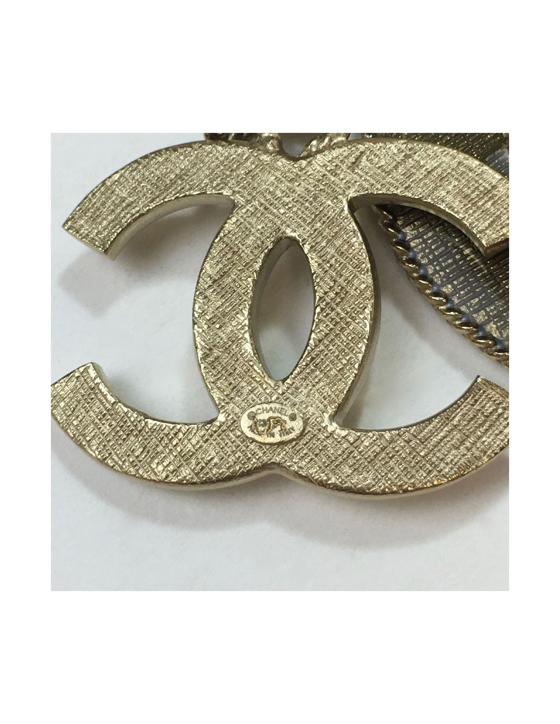 Collier Chanel pendentif N°5 en résine dorée et pailletée et CC doré, chaîne anneaux en métal doré or pâle.