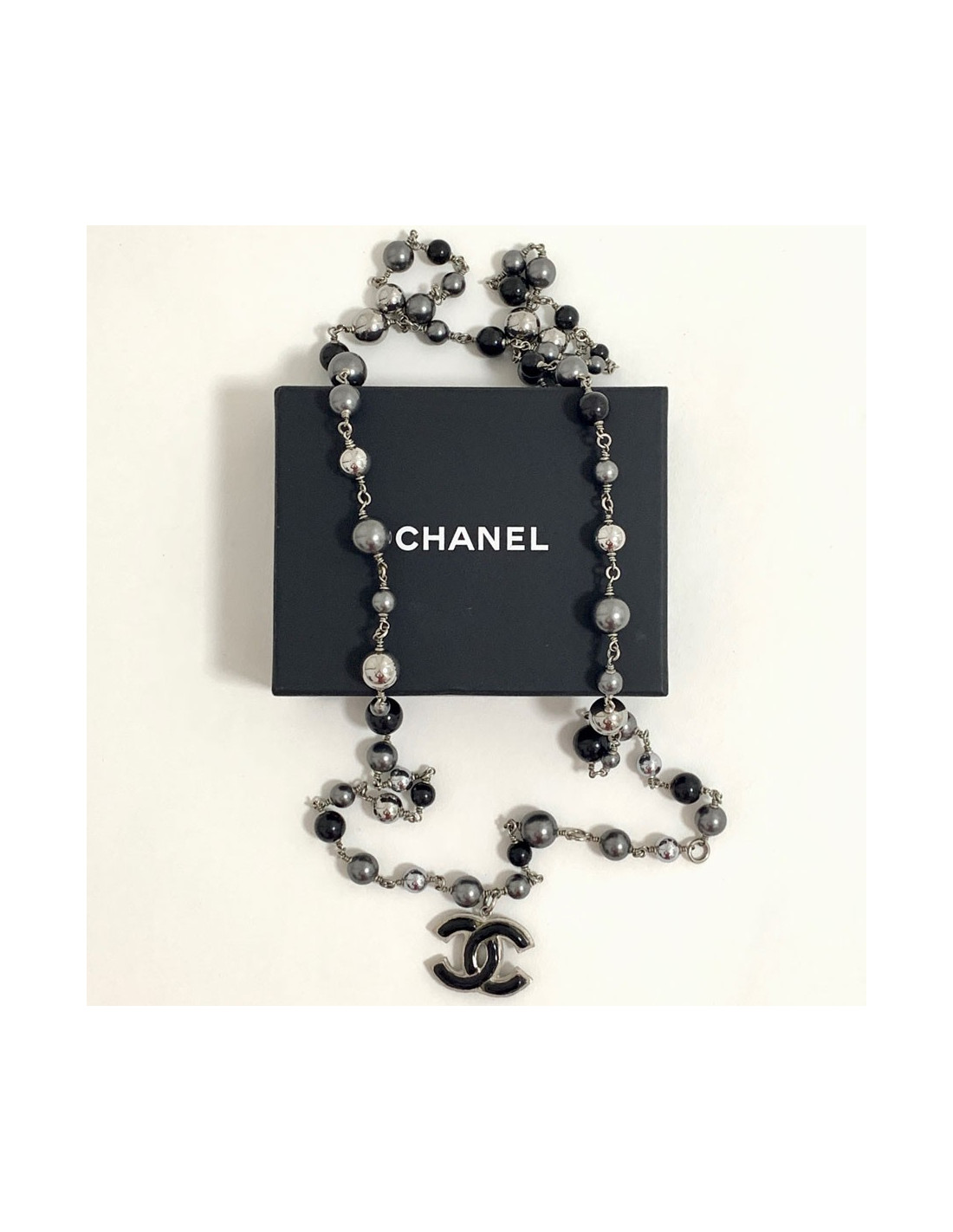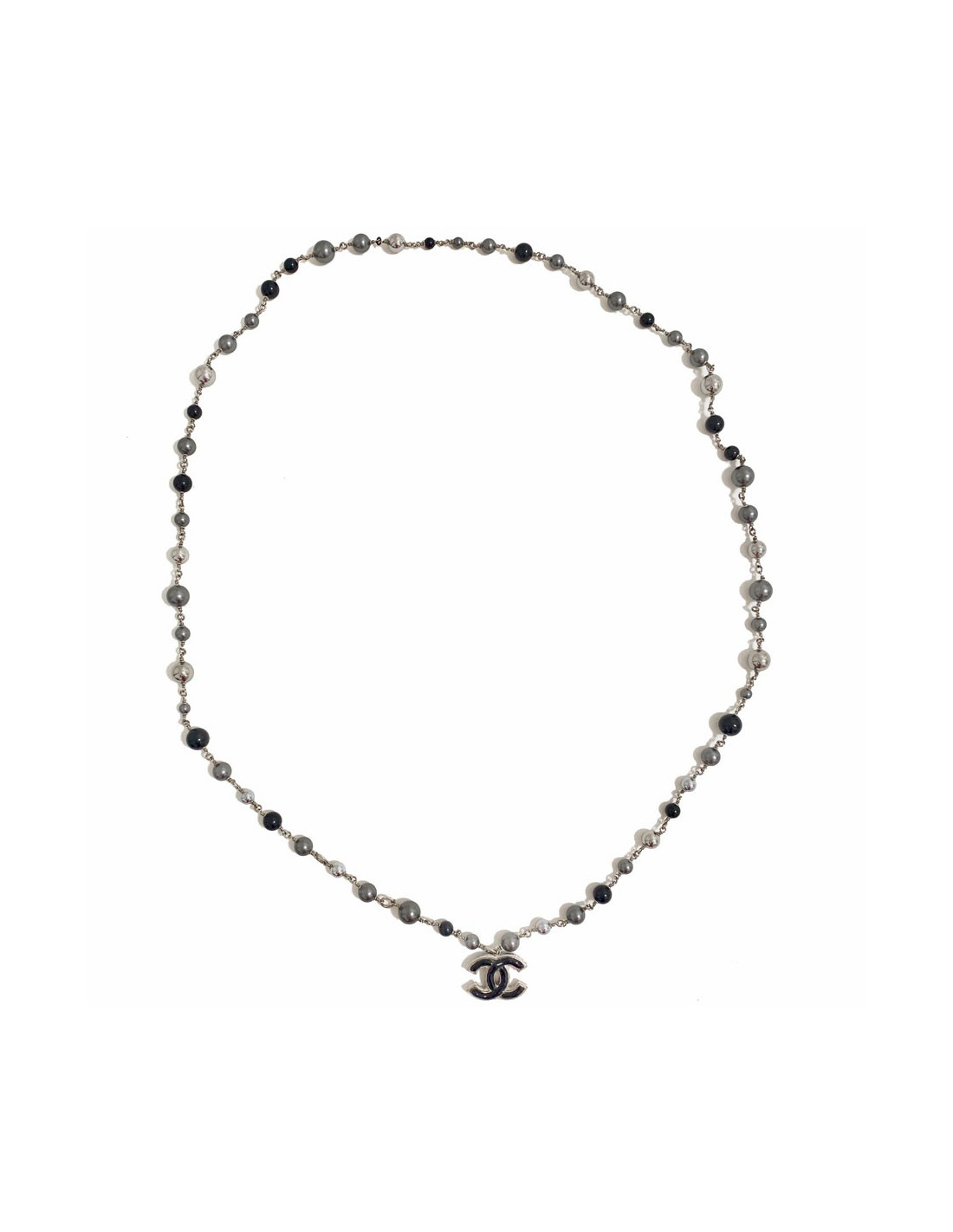 Chic! Superbe sautoir de la maison CHANEL entièrement fait de perles grises, noires et argentées. Un pendentif CC en metal argenté et résine noir termine ce sautoir.