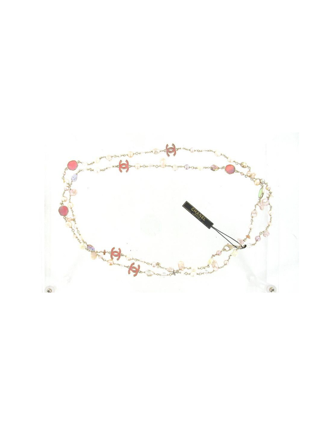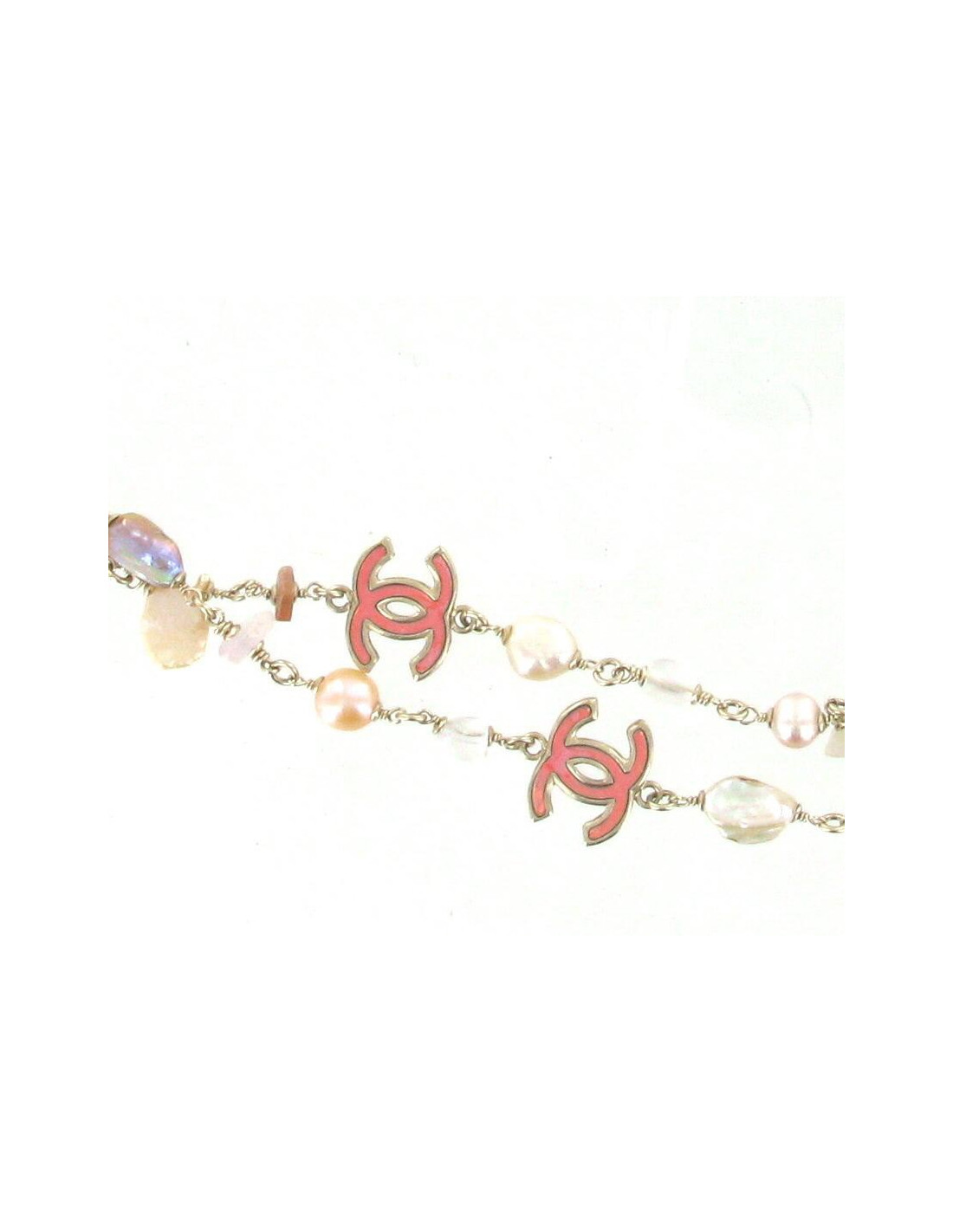 Ce sautoir CHANEL aux couleurs estivales rose pâle, blanc et doré. Il est composé de perles d'eau douce et de perles de différentes tailles, formes plates et CC à effet miroir multicolore. La chaîne est en métal doré brillant ainsi que les sigles "CC". Ces derniers changent de couleurs à la lumières (rose, jaune, bleu). Livré dans un joli pochon.
