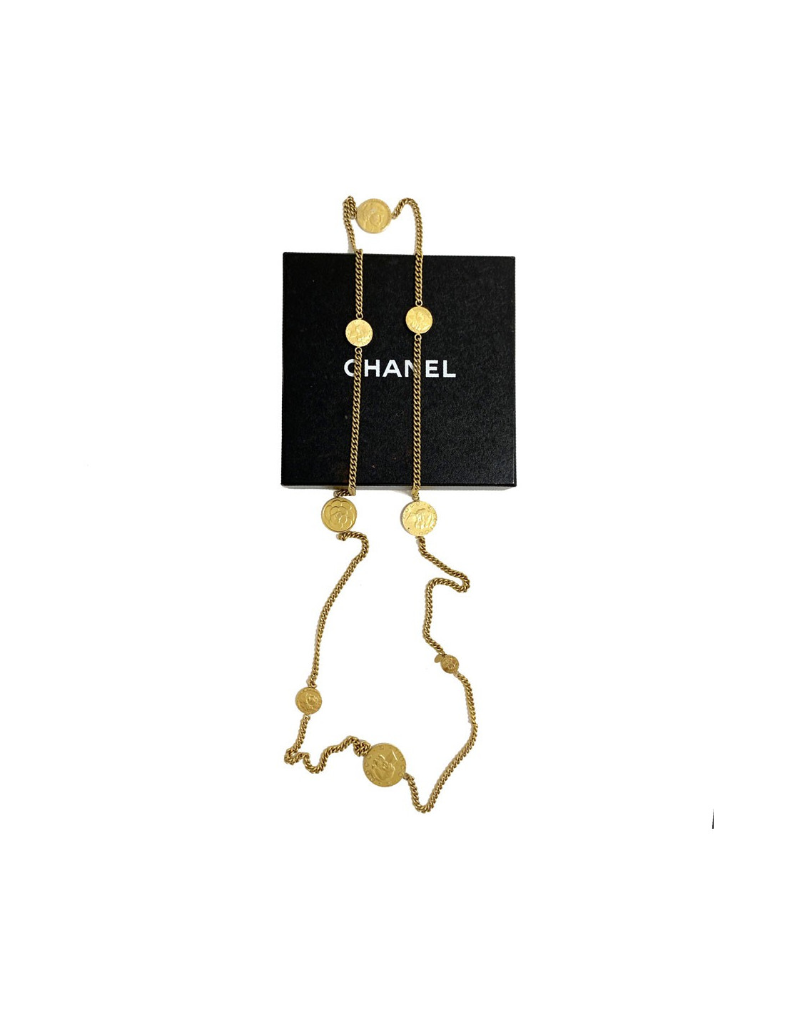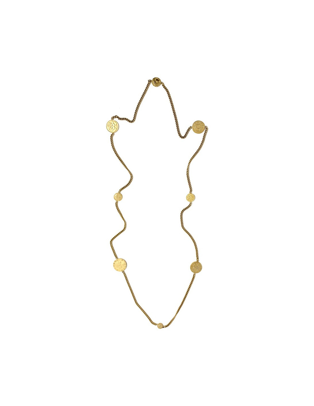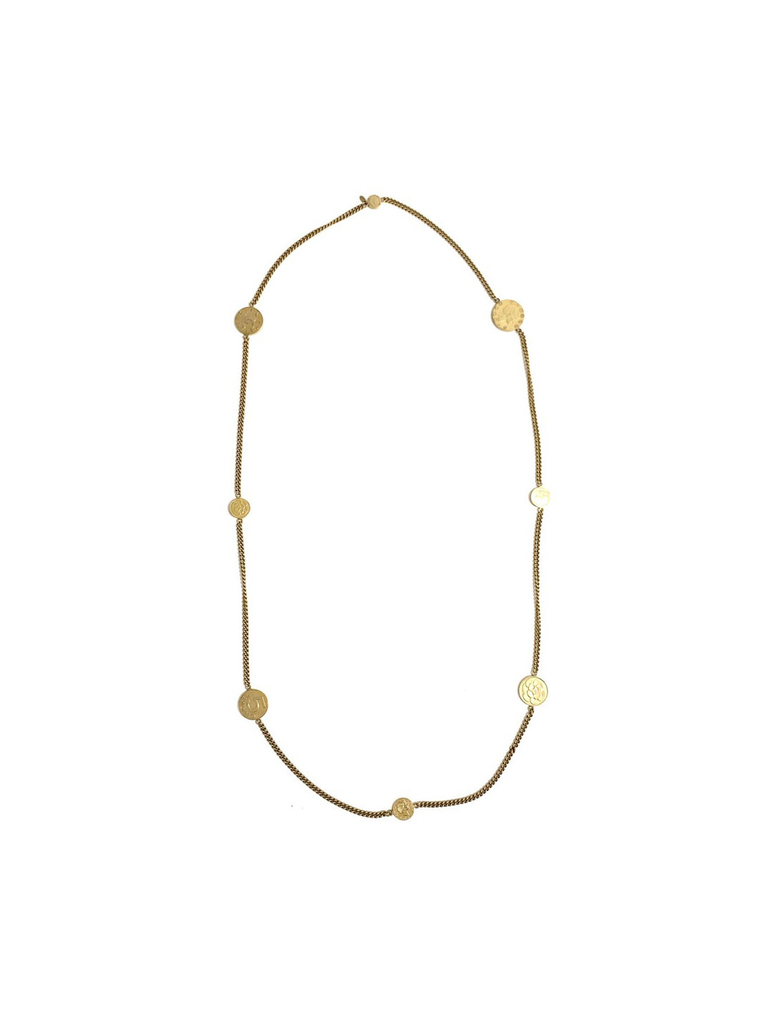 Très beau sautoir médailles et chaine en métal doré. Les médailles sont à l'effigie de Madame Coco CHANEL, représente également un camélia, le Numéro 5. Accessoirisez votre tenue avec ce collier. Vous pouvez le porter en simple tour ou double tour.