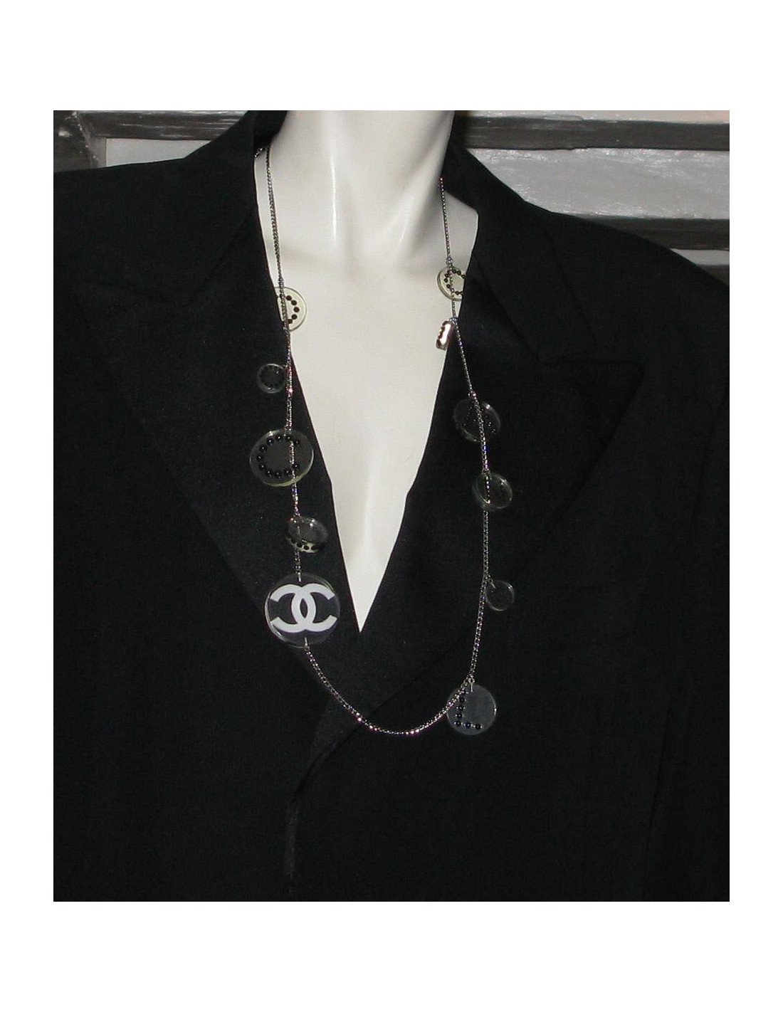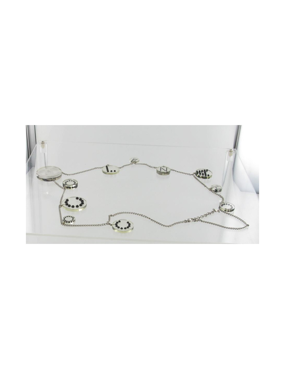 Ceinture sautoir CHANEL en plexiglass transparent et noir. La chaîne du sautoir est en métal argenté. Sur chaque rond est gravé une lettre : "Coco Chanel" ainsi que le sigle "C C".