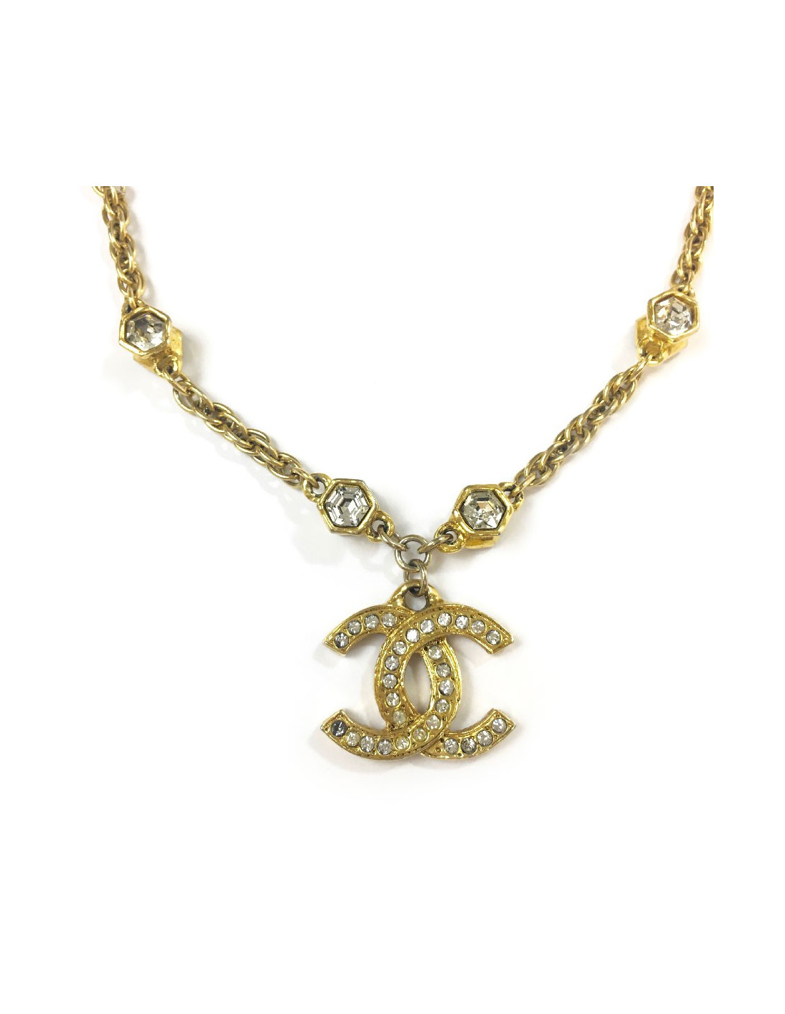 Collier Chanel en métal doré, pendentif CC serti de brillants, strass hexagonaux.