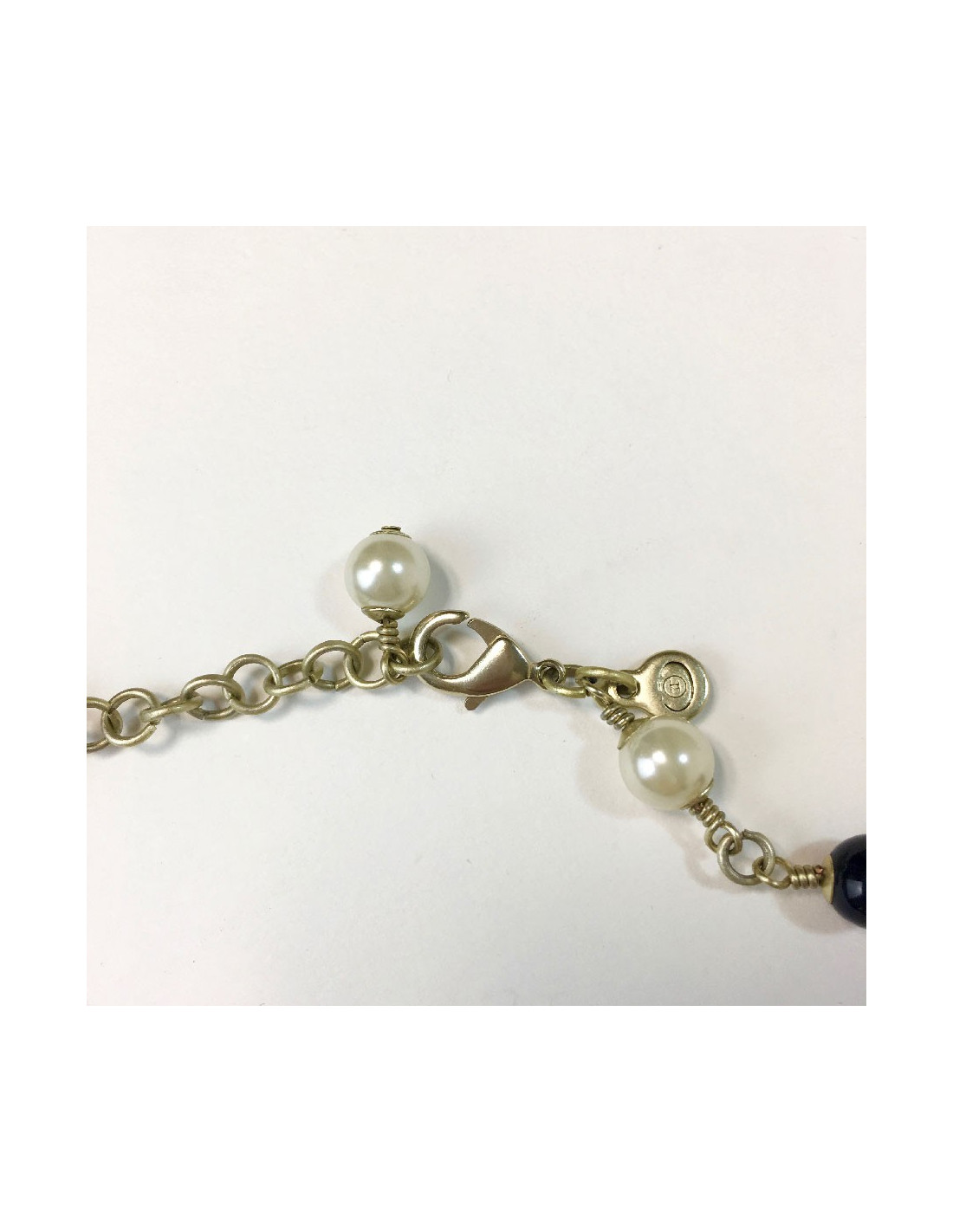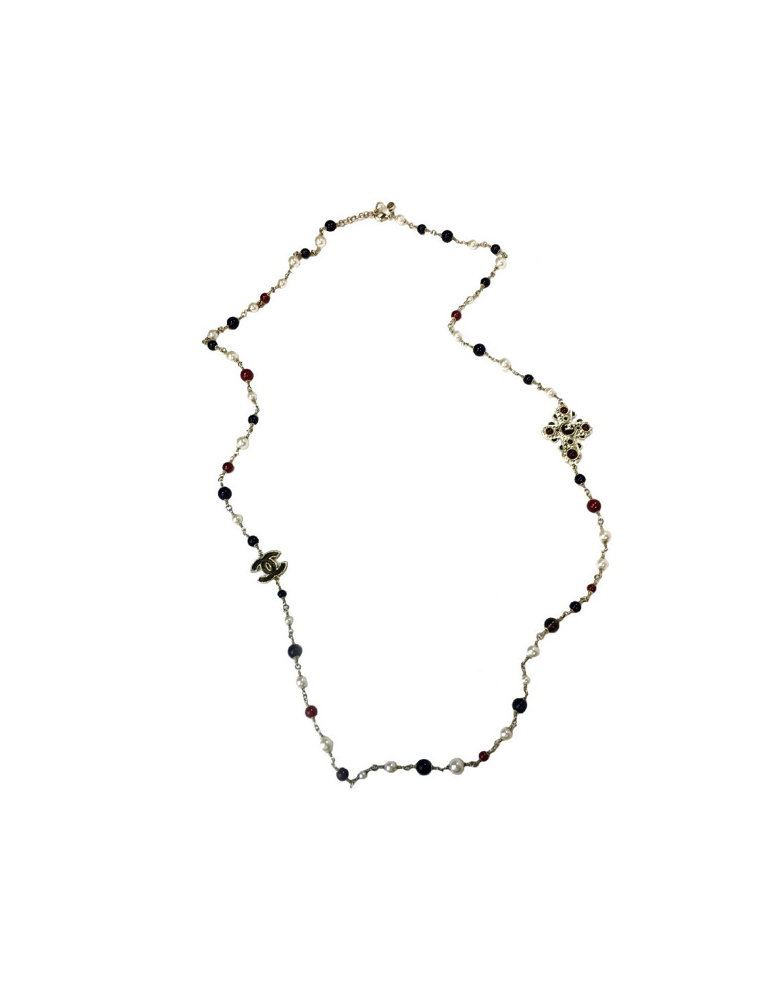 Sautoir Chanel, perles nacrées, noires et ambres et croix en métal doré.