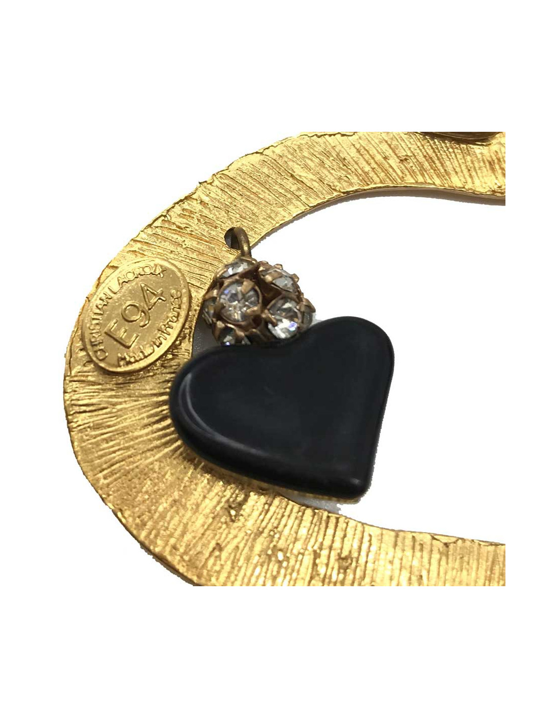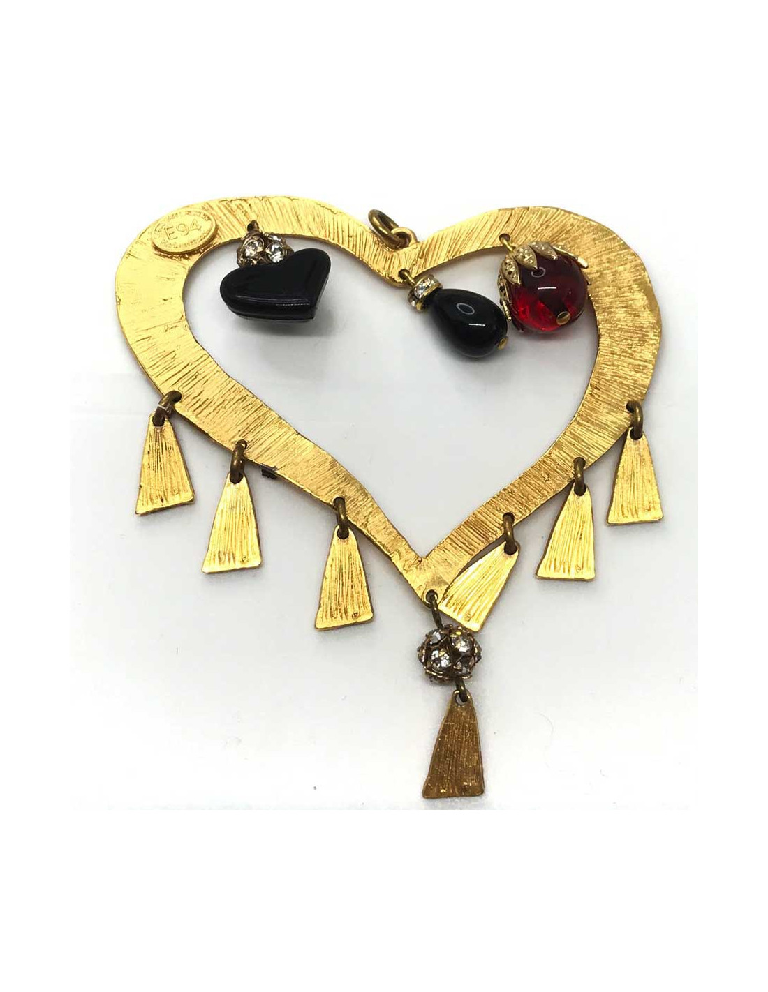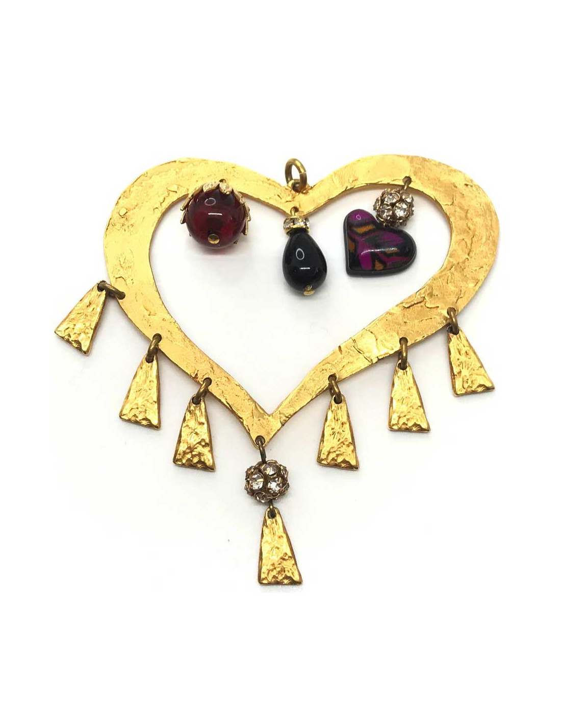 Le pendentif est de la Maison CHRISTIAN LACROIX. En métal doré à l'or fin, il représente le contour d'un coeur auquel est accroché des pampilles. Il laisse pendre un coeur sur lequel on perçoit une hirondelle violette, et deux autres charms en forme de goutte, l'un rouge et l'autre noir.