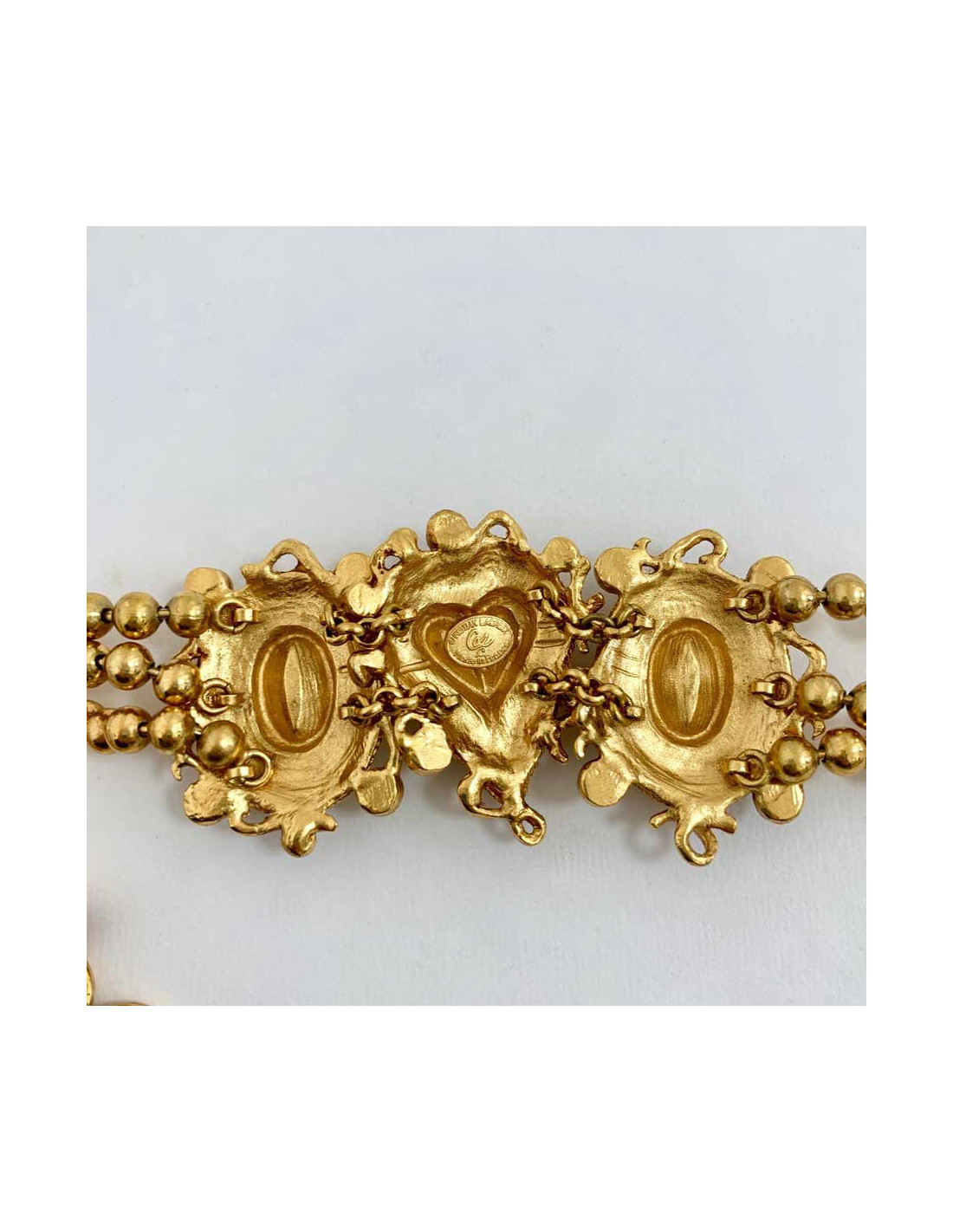 Le collier est un ras de cou de la Maison CHRISTIAN LACROIX. Vintage, il représente une triple rang de perles en métal dorées sur lequel viennent s'apposer un coeur et deux autres cabochons de strass tantôt bleus, verts et violets.