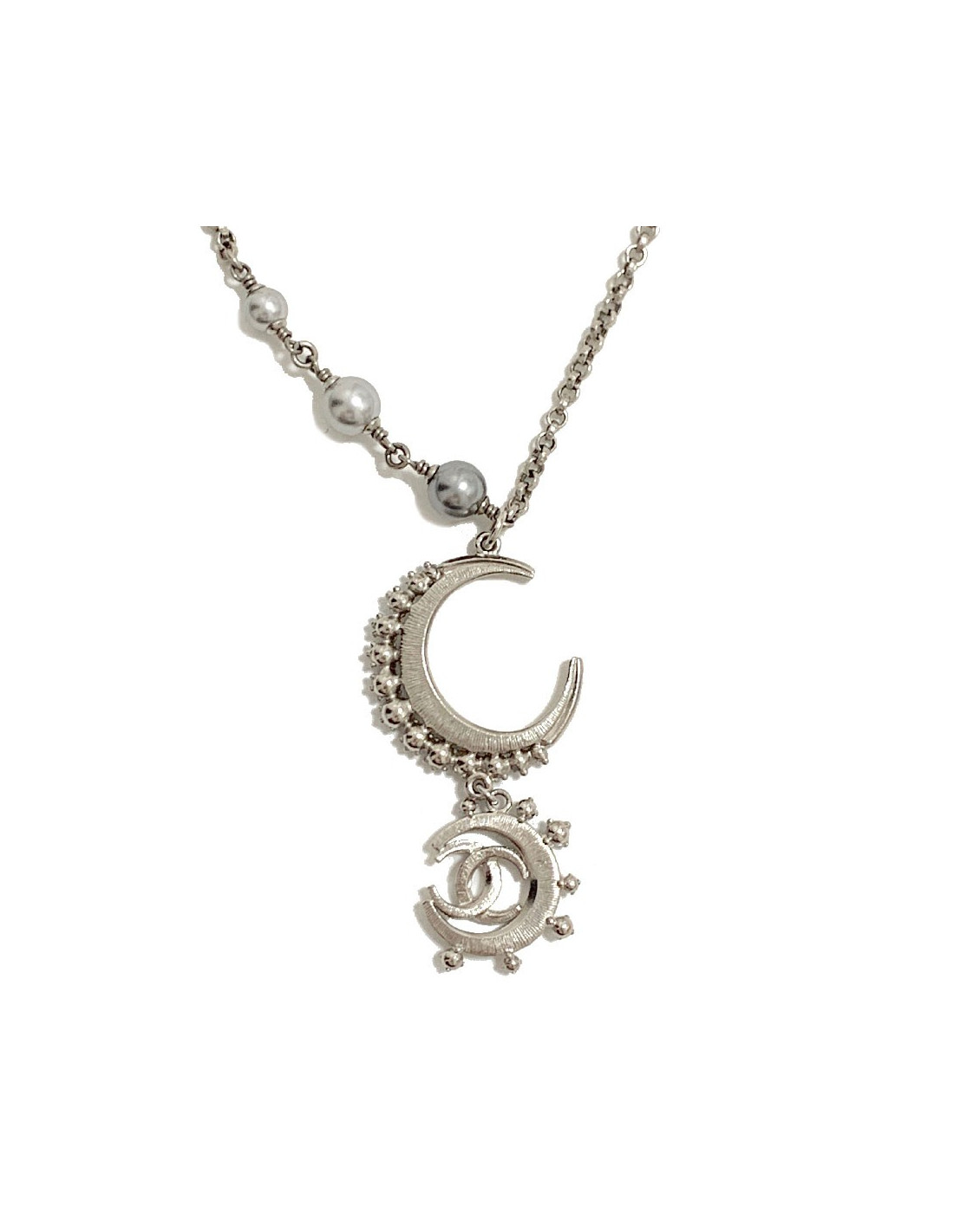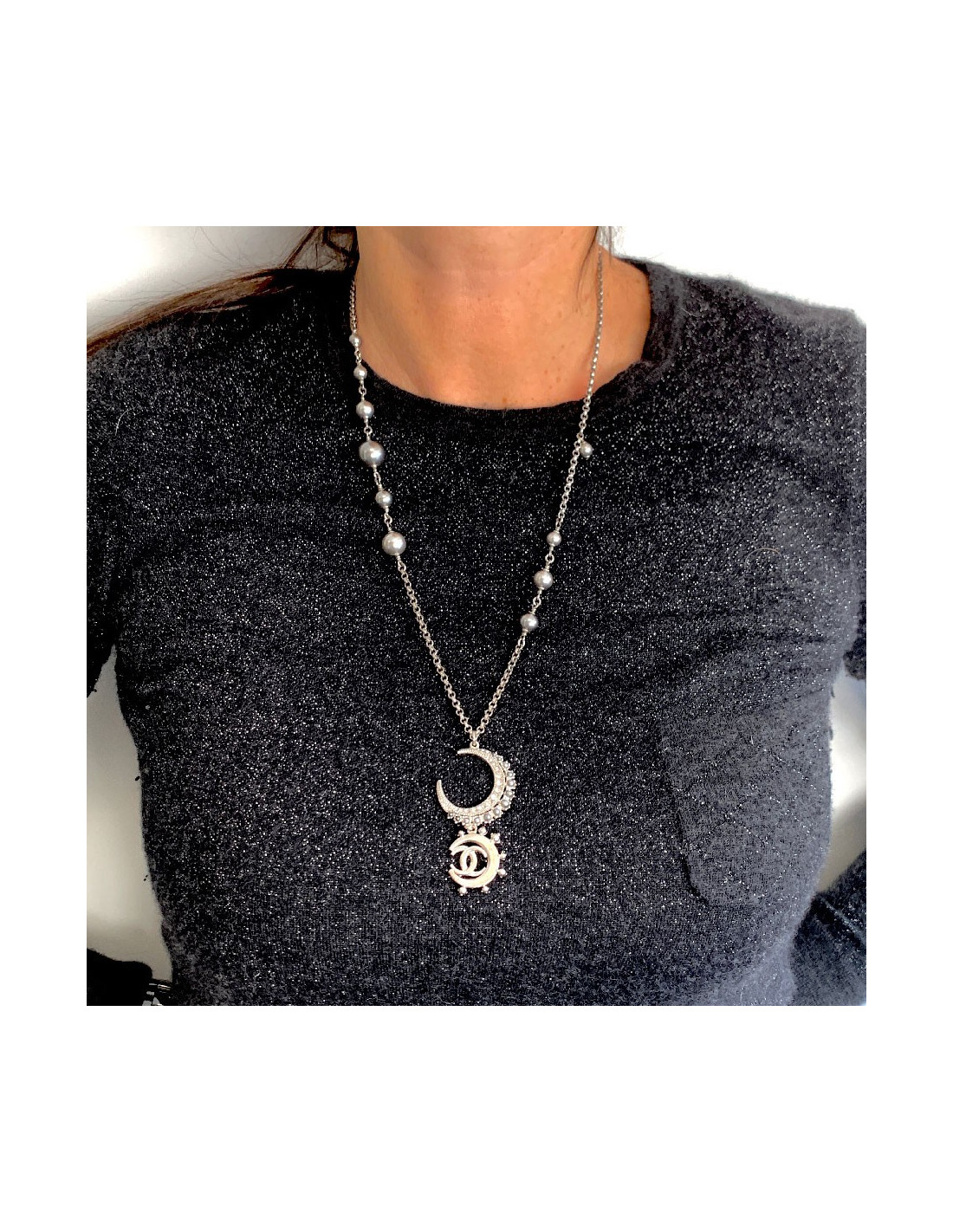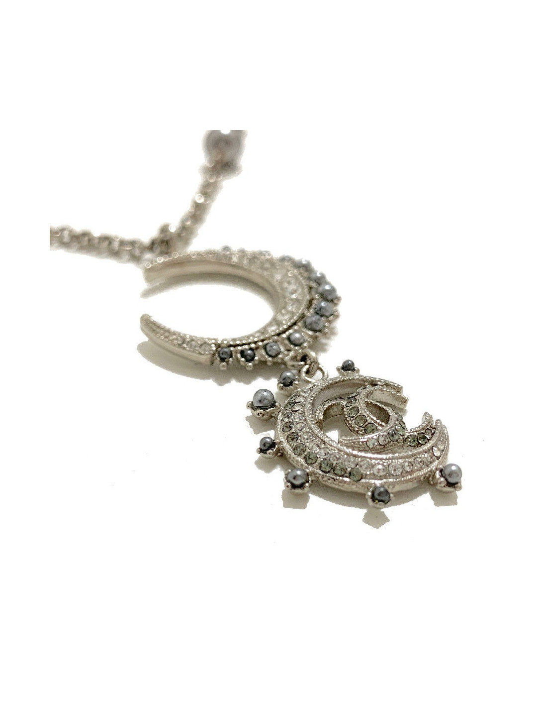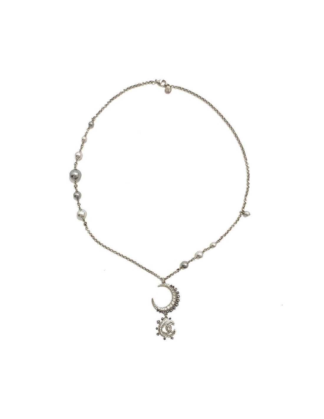 Superbe bijou! Collier CHANEL en métal argenté agrémenté de perles grises et d'un magnifique pendentif lune serti de strass blancs et de perles grises de petite taille. Le CC est également serti de strass blancs.