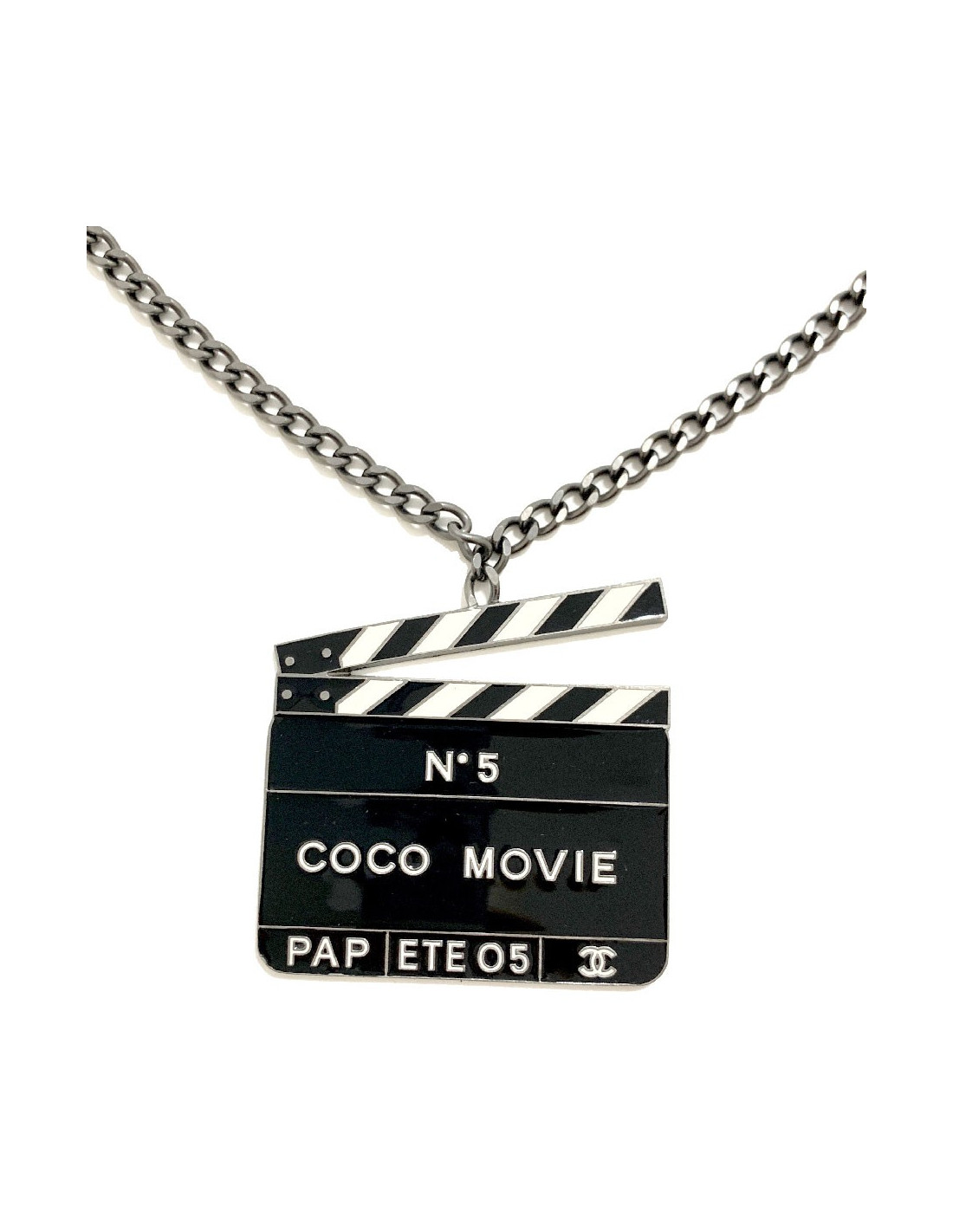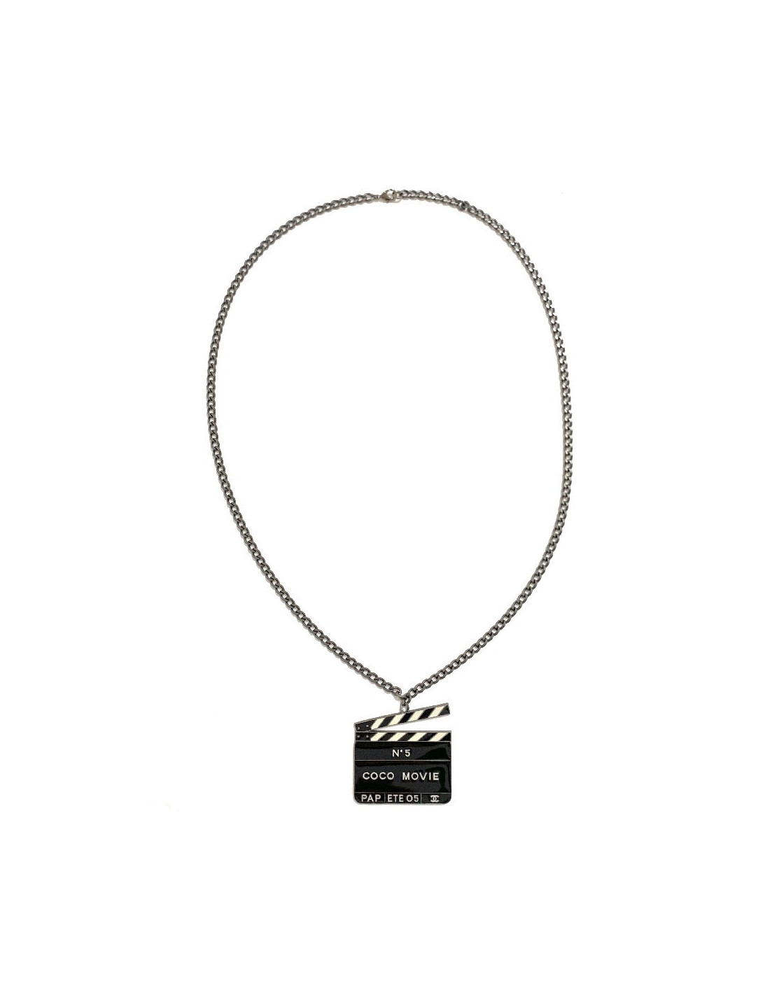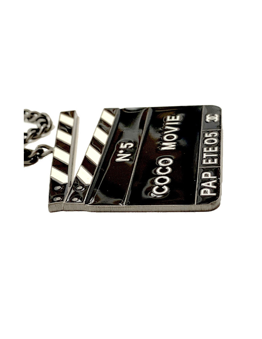 Très beau sautoir CHANEL, collection Coco Movie N°5 PAP ETE 05. Chaine en ruthénium et pendentif en forme de clap de fin en métal ruthénium et résine noire et blanche.