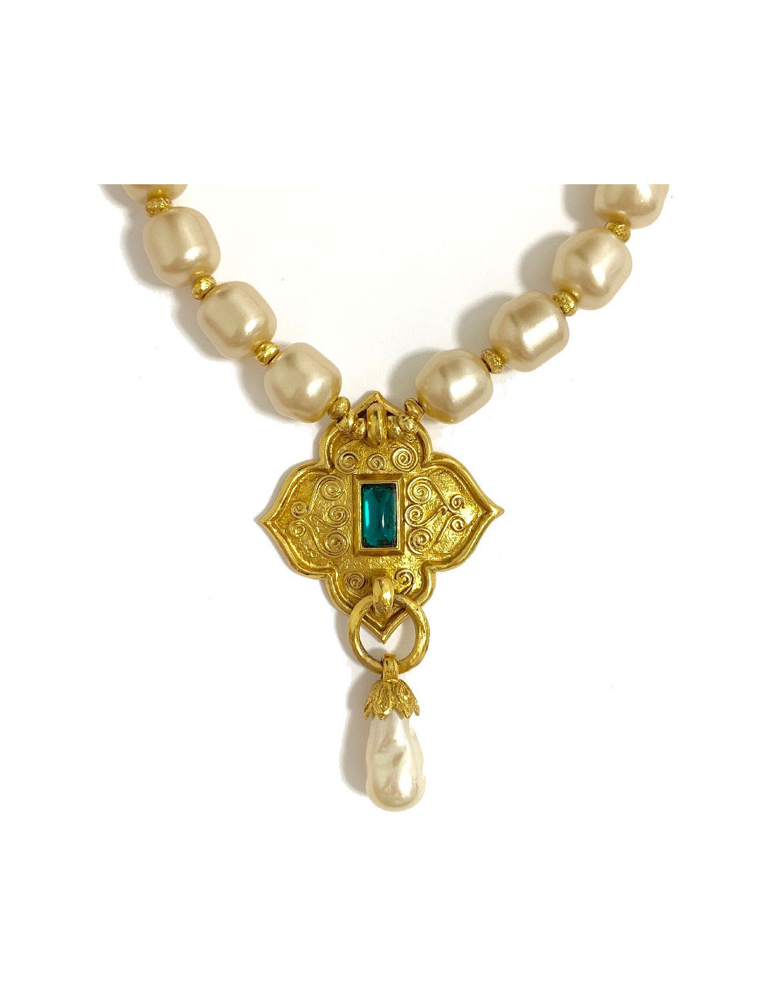 Très beau collier Jean Louis SCHERRER vintage. Il est fait de grosses perles carrées nacrées, d'un pendentif en métal doré serti d'une pierre fantaisie couleur émeraude et d'une perle goutte. Le fermoir est un fermoir crochet en métal doré.