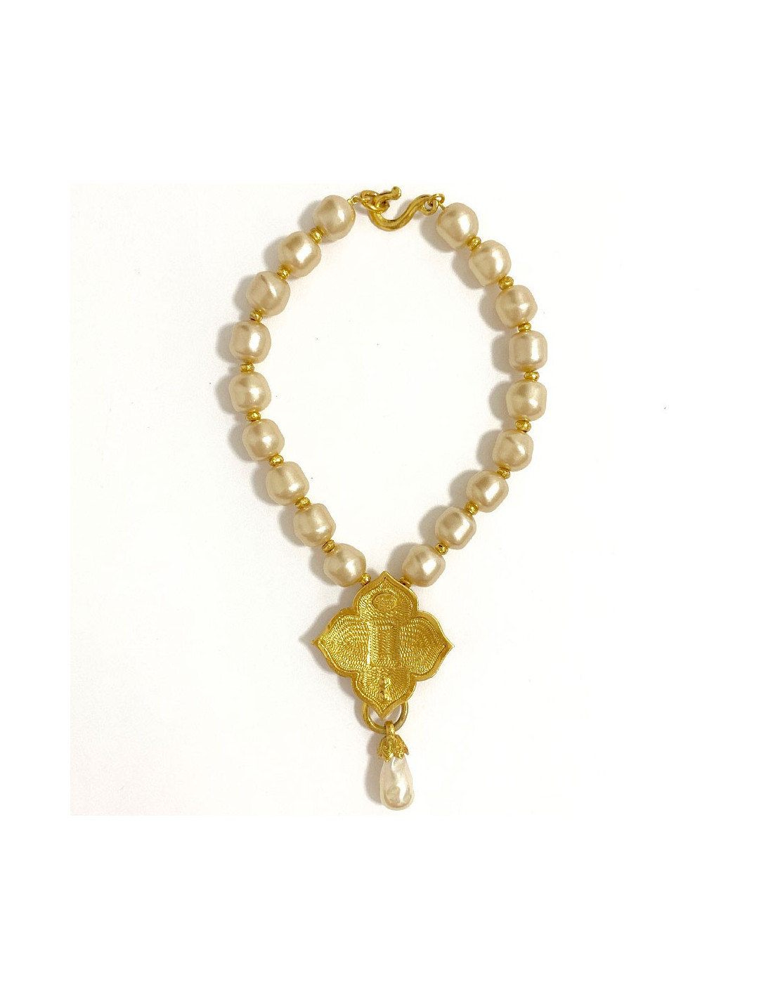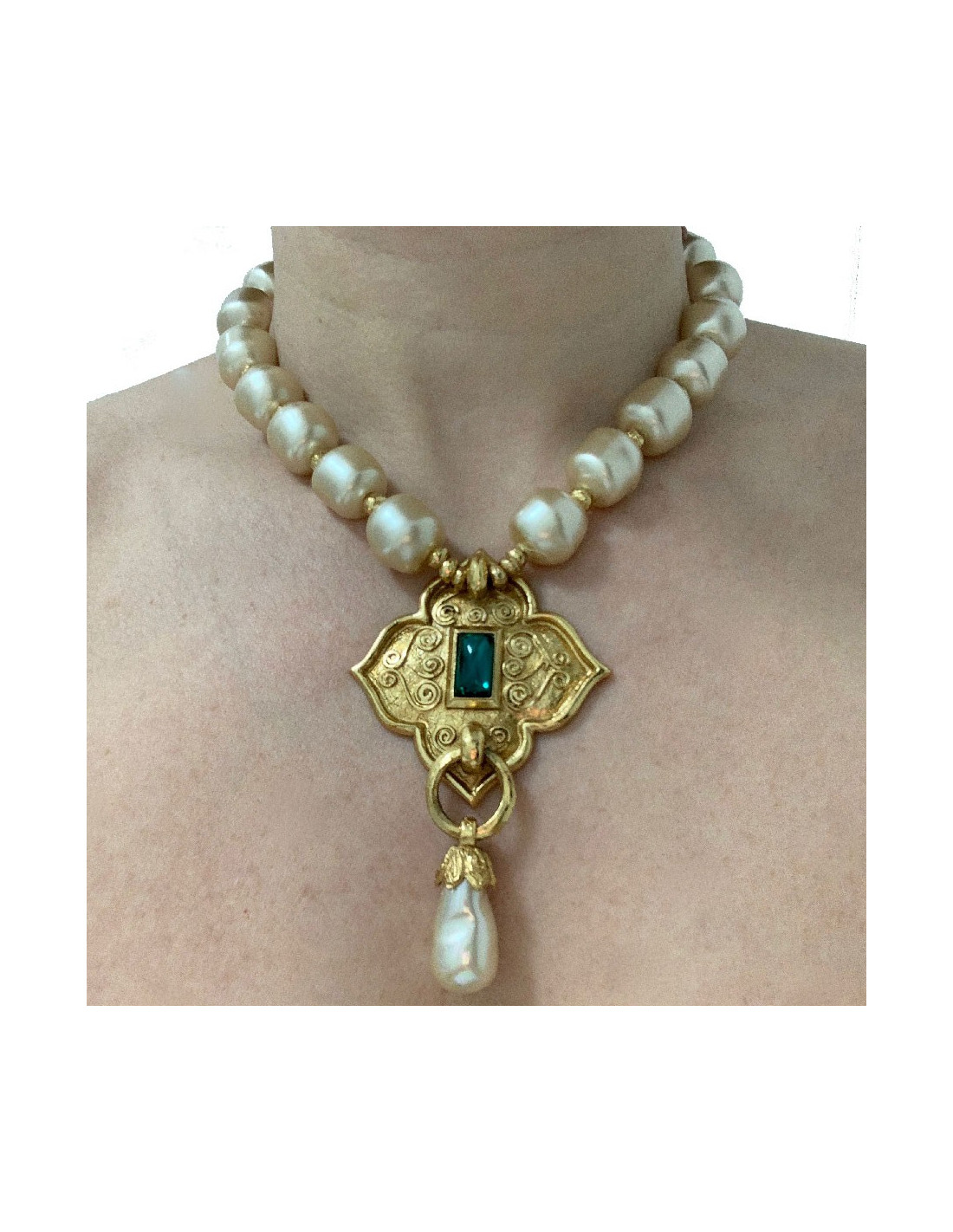 Ses dimensions : longueur totale (perles+fermoir) : 21 cm, taille du pendentif (métal + perle) : 5,5x9,5 cm. Taille des perles : 1,5 cm