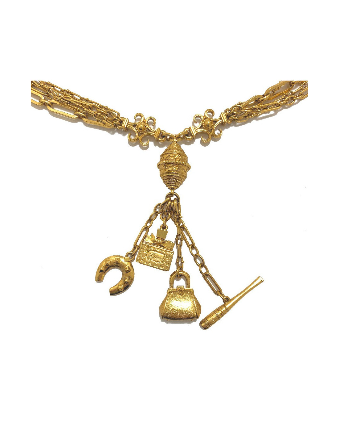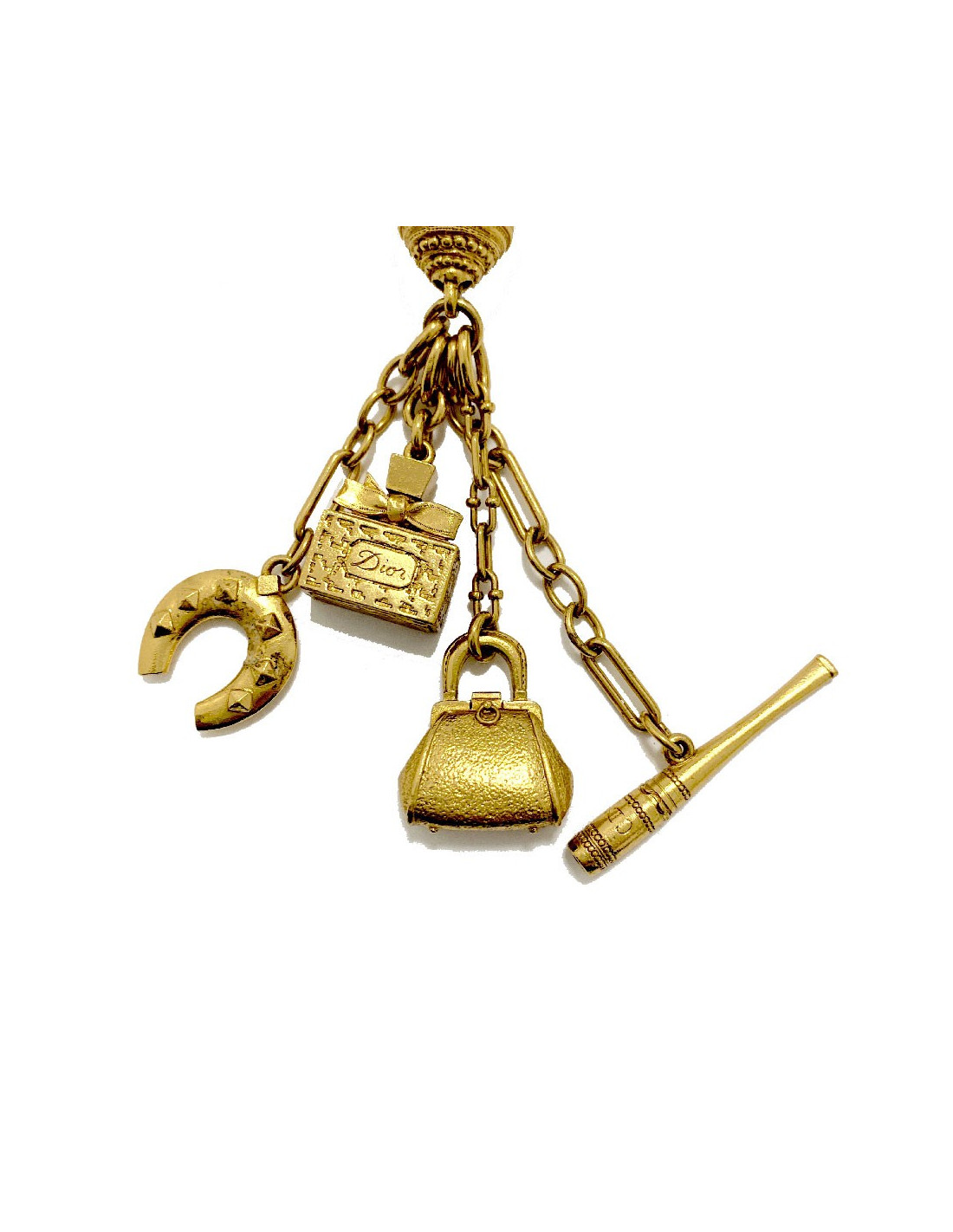 Splendide long sautoir de la Maison CHRISTIAN DIOR. Il est composé de multi chaines de différentes formes en métal doré et d'un pendentif sur lequel sont accrochés 4 charms (fer à cheval, bouteille de parfum, sac et une batte de base ball).