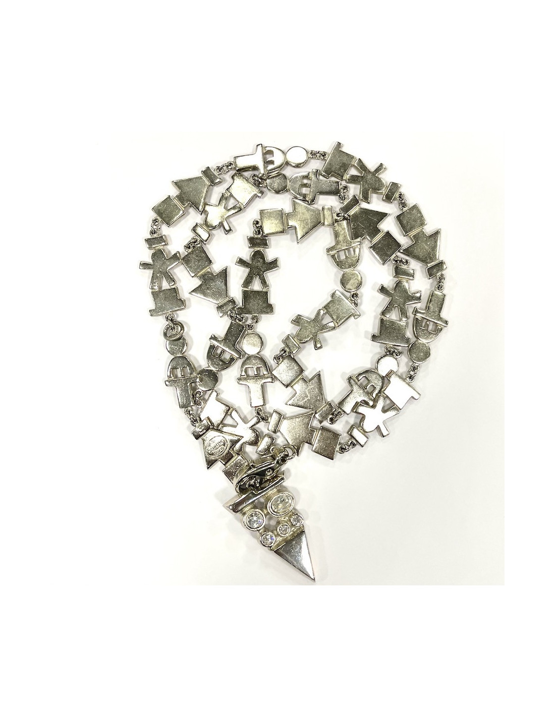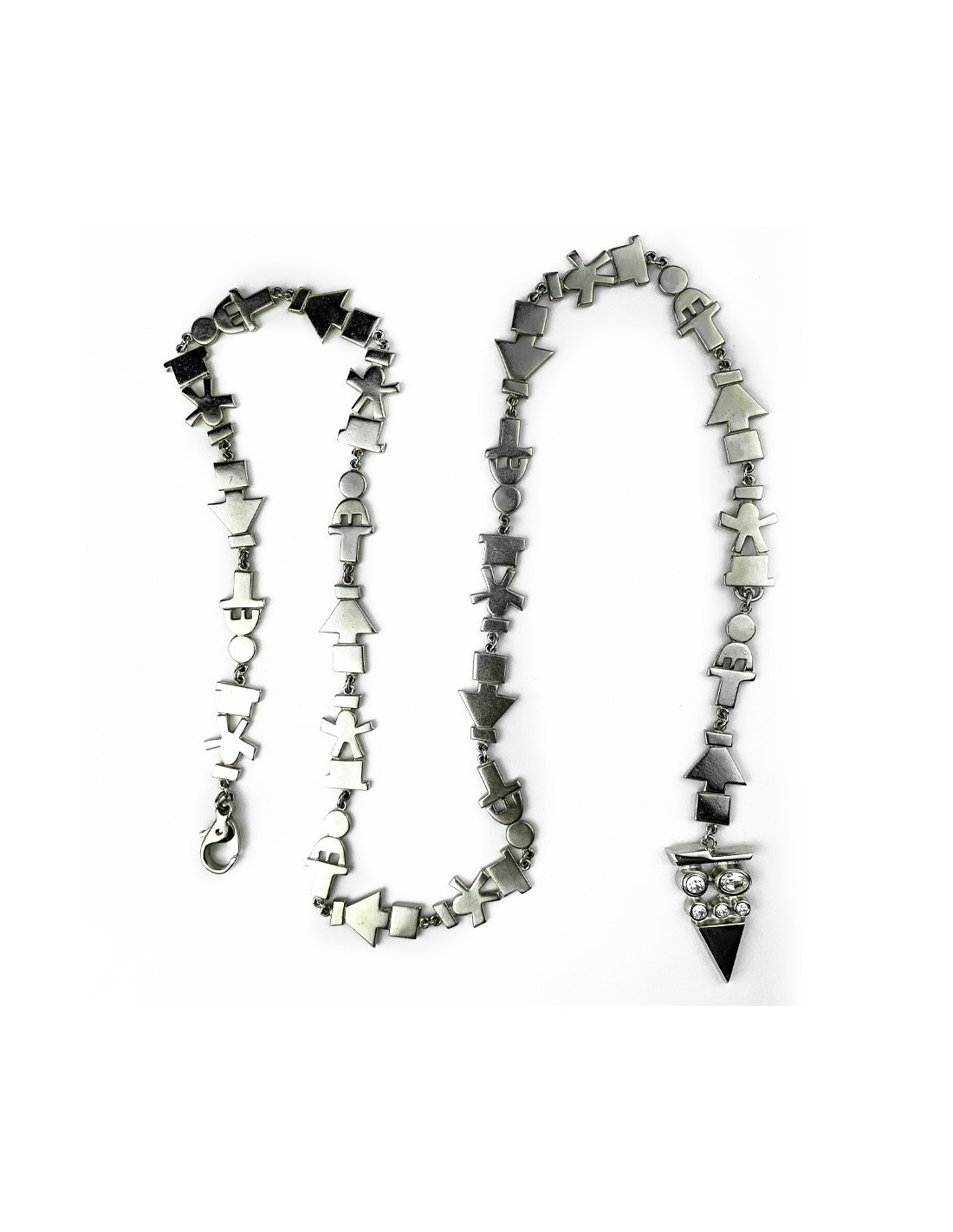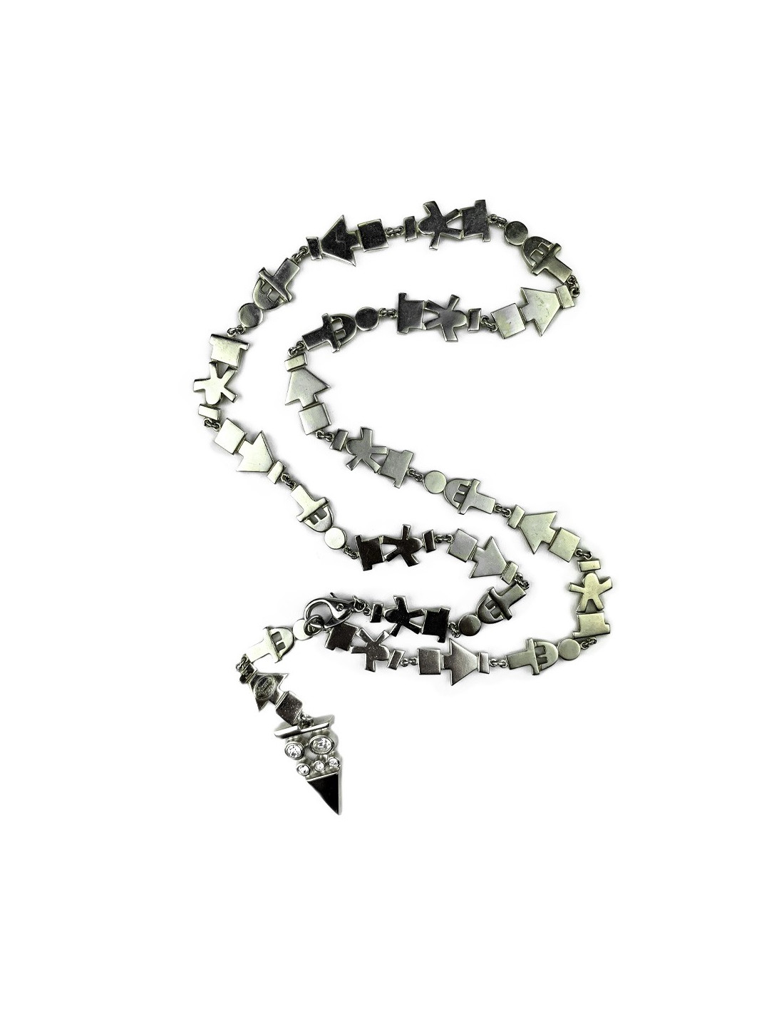 Le bijou est de la Maison JEAN-LOUIS SCHERRER. Il représente une longue frise sur laquelle s'alignent des personnages et des flèches directionnelles. Le sautoir se ferme par un mousqueton. Il se termine par un pendentif en forme de triangle serti de strass. Pour un look moderne et rock.