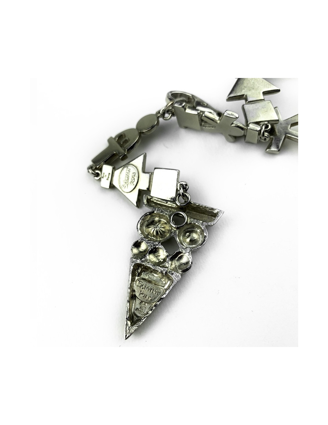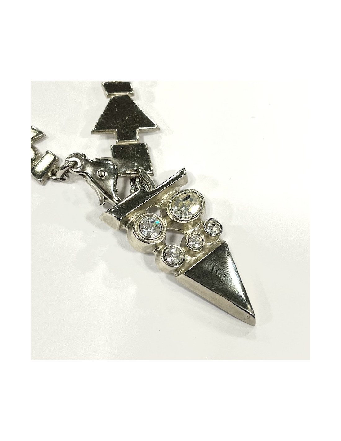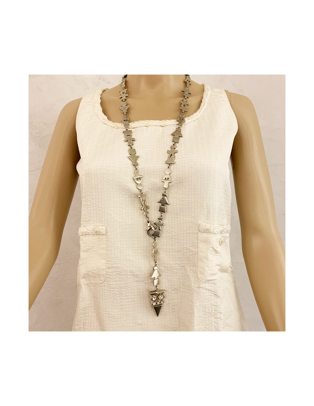 Le bijou est de la Maison JEAN-LOUIS SCHERRER. Il représente une longue frise sur laquelle s'alignent des personnages et des flèches directionnelles. Le sautoir se ferme par un mousqueton. Il se termine par un pendentif en forme de triangle serti de strass. Pour un look moderne et rock.