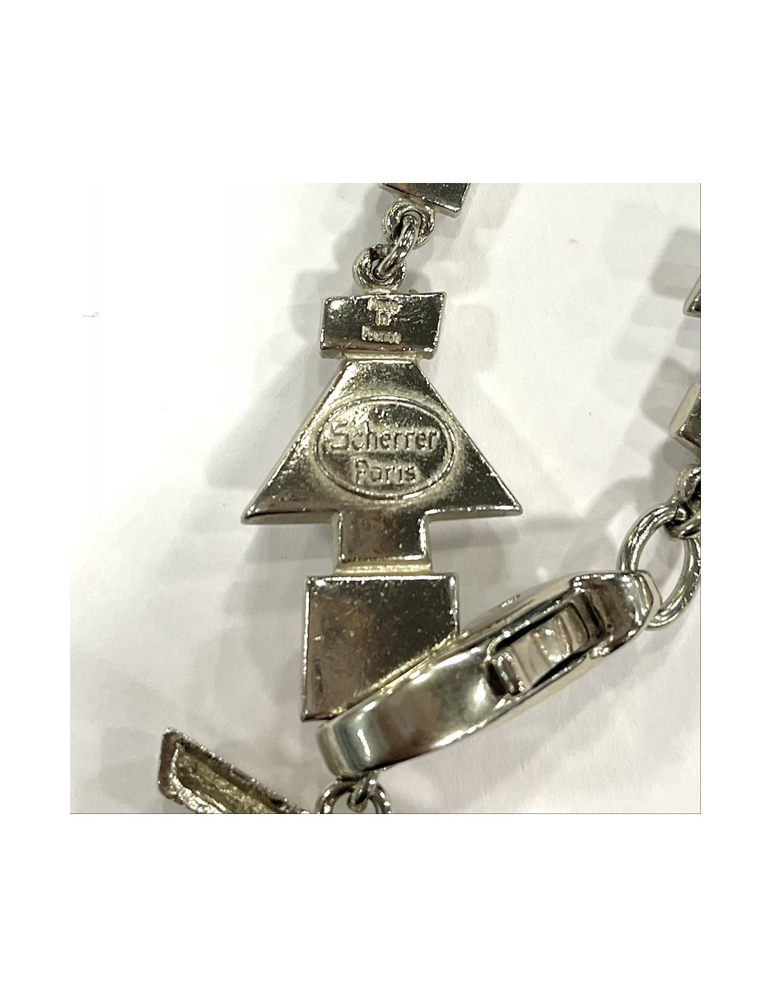 Le collier est en très bon état. Il mesure 1 mètre. Nous constatons derrière le pendentif, la présence de la marque SCHERRER Paris et de la mention Made In France.