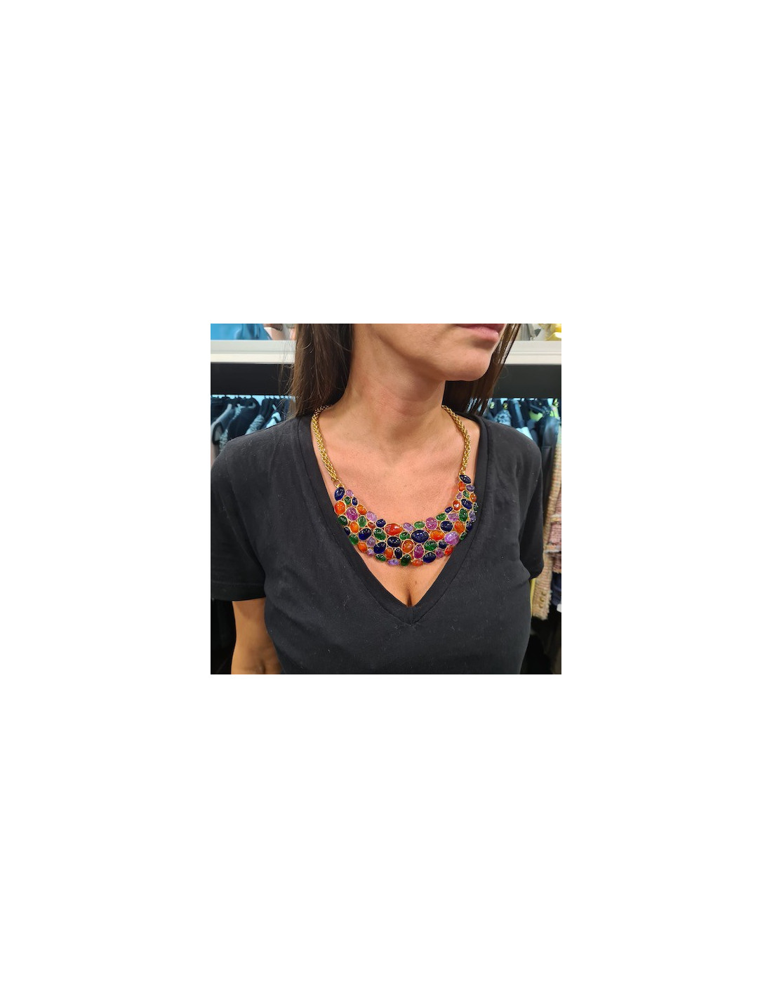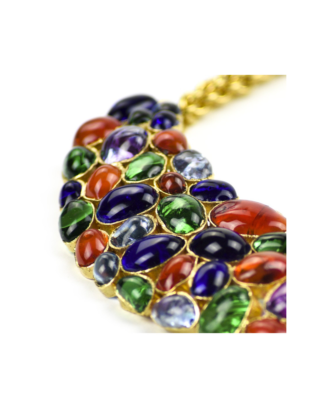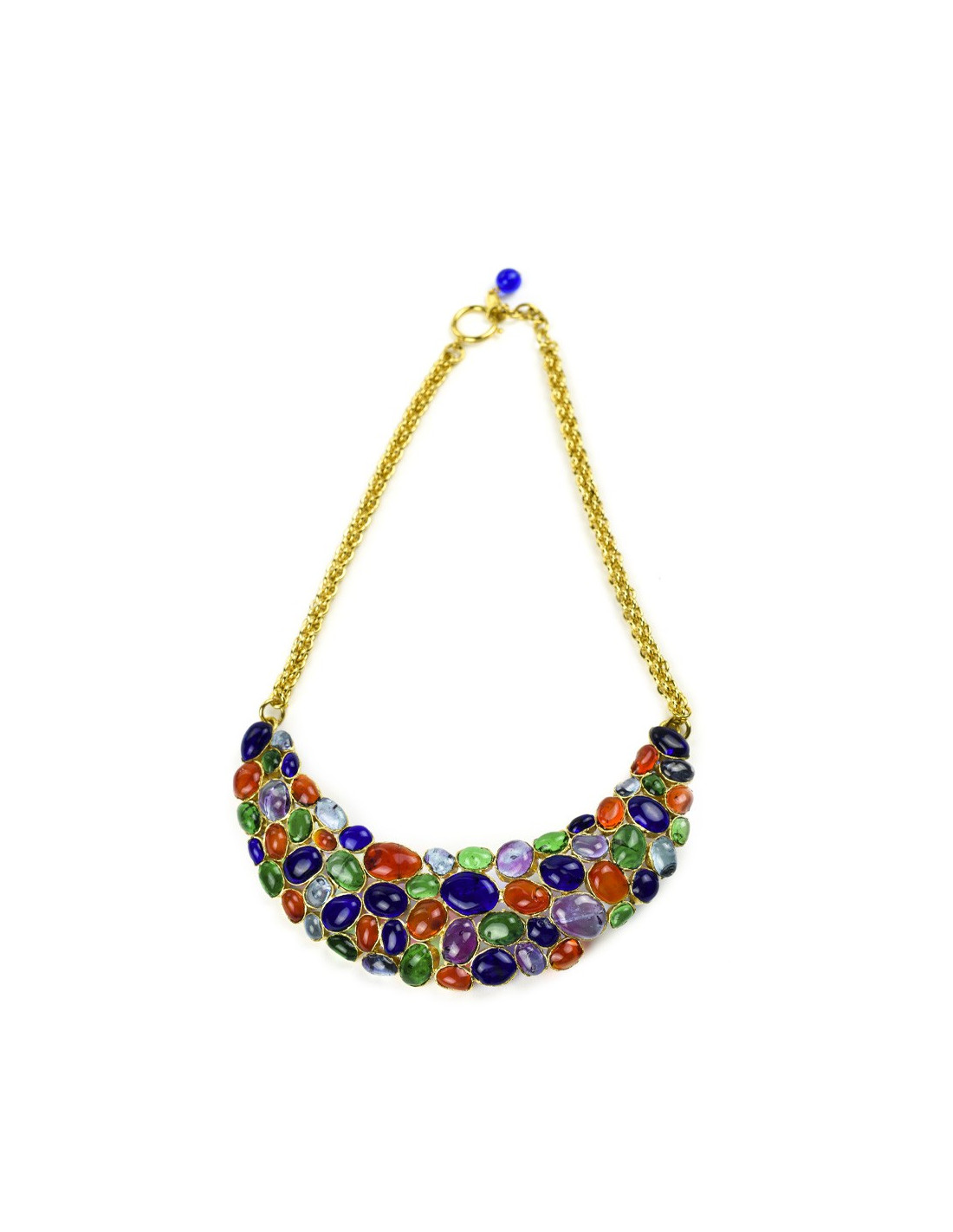 Pour apporter une touche chic à votre cou, un collier plastron Chanel, en pâte de verre multicolore saphir, vert émeraude, violet et topaze avec pour attache une chaîne dorée. Travail réalisé entièrement à la main.