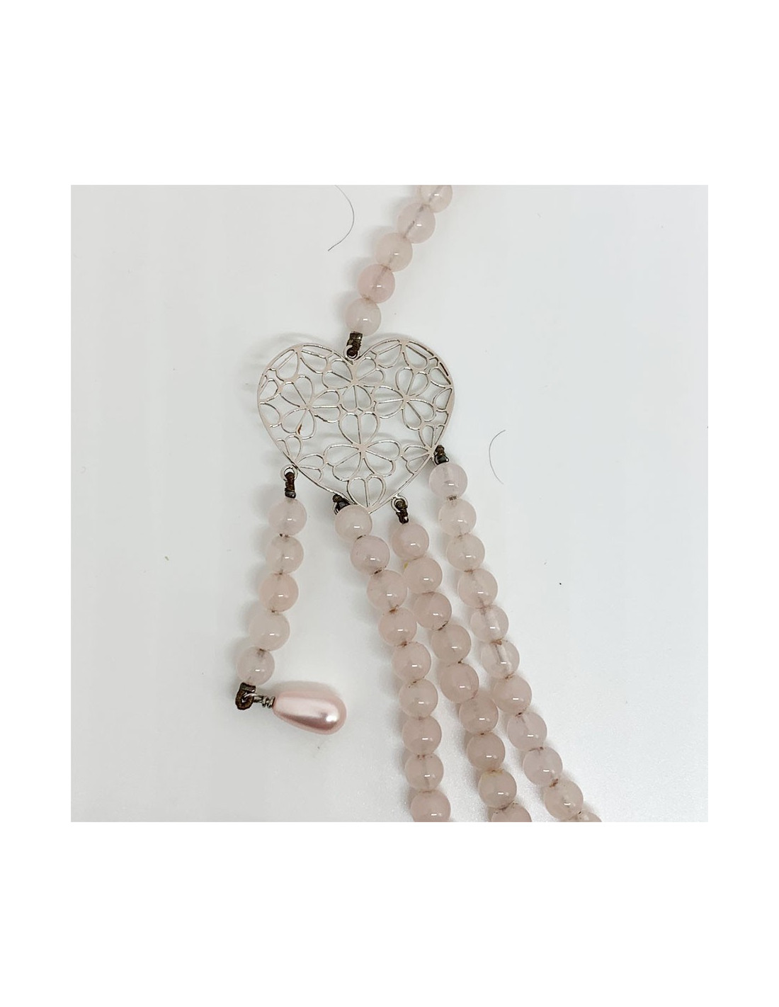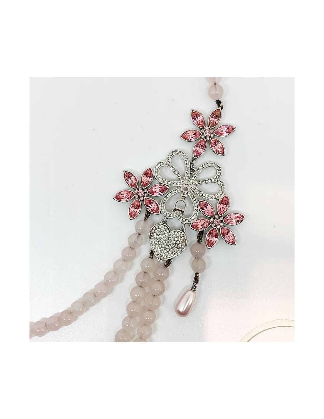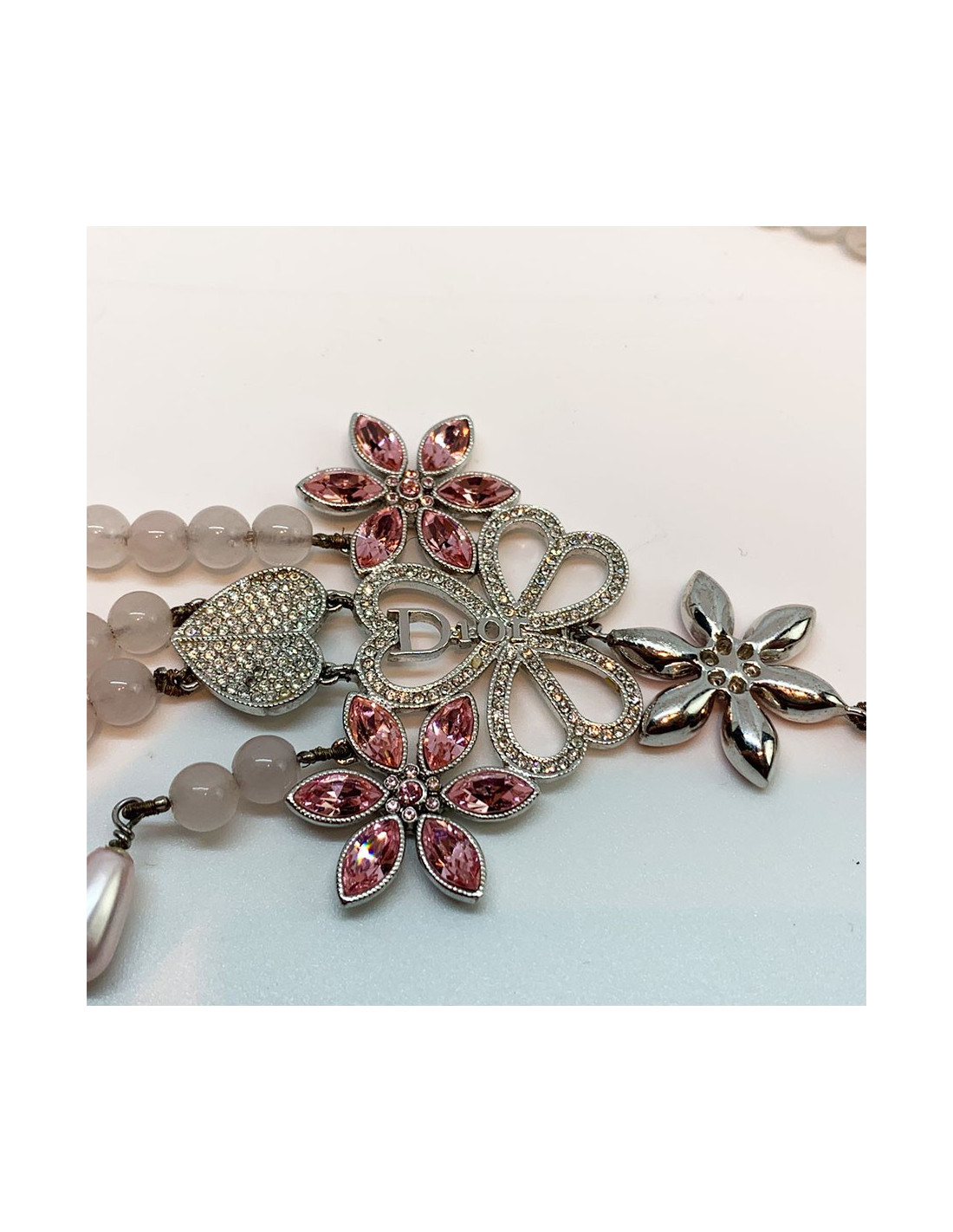 Le sautoir provient de la Maison CHRISTIAN DIOR. C'est un collier triple rangs de perles en quartz rose pâle qui comporte d'un côté un coeur en métal argenté, et de l'autre un assemblage d'étoiles en strass rose foncé et de coeurs en strass blancs. Les coeurs centraux comportent la marque DIOR en métal argenté.