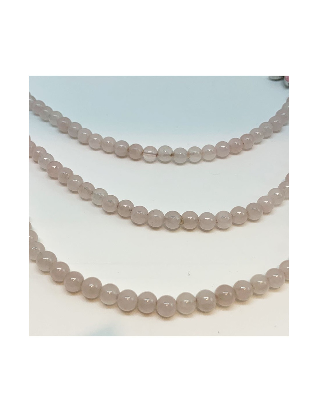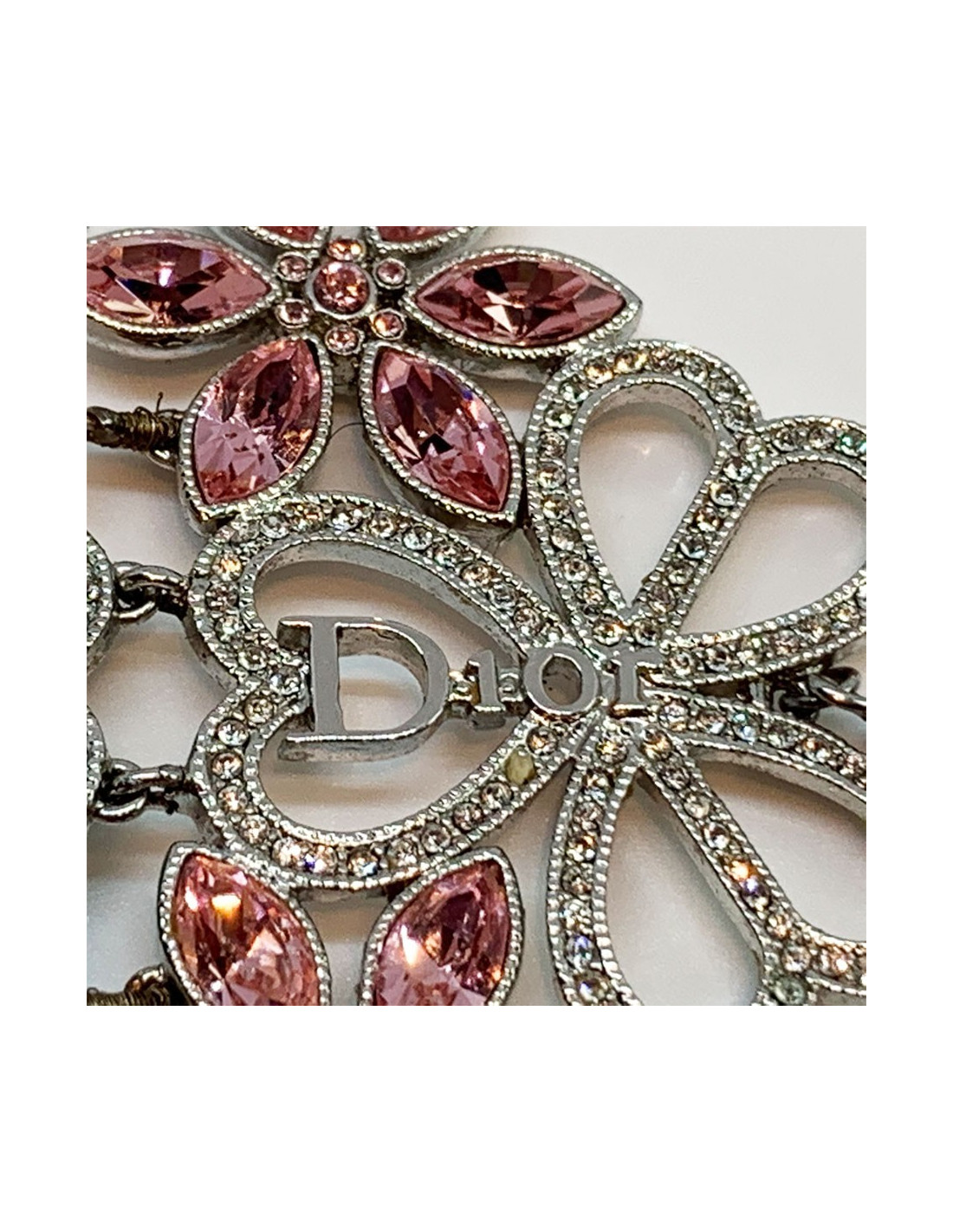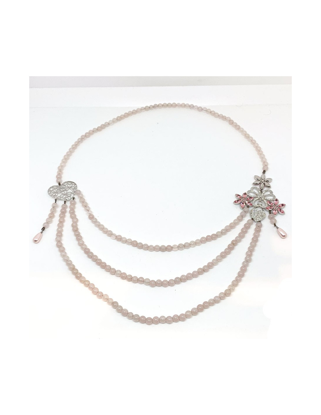 Le sautoir provient de la Maison CHRISTIAN DIOR. C'est un collier triple rangs de perles en quartz rose pâle qui comporte d'un côté un coeur en métal argenté, et de l'autre un assemblage d'étoiles en strass rose foncé et de coeurs en strass blancs. Les coeurs centraux comportent la marque DIOR en métal argenté.