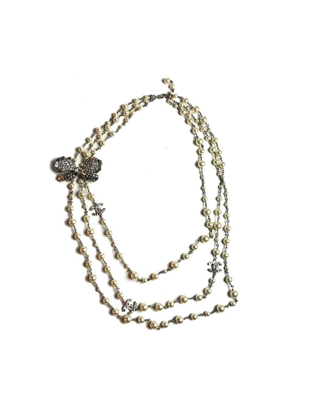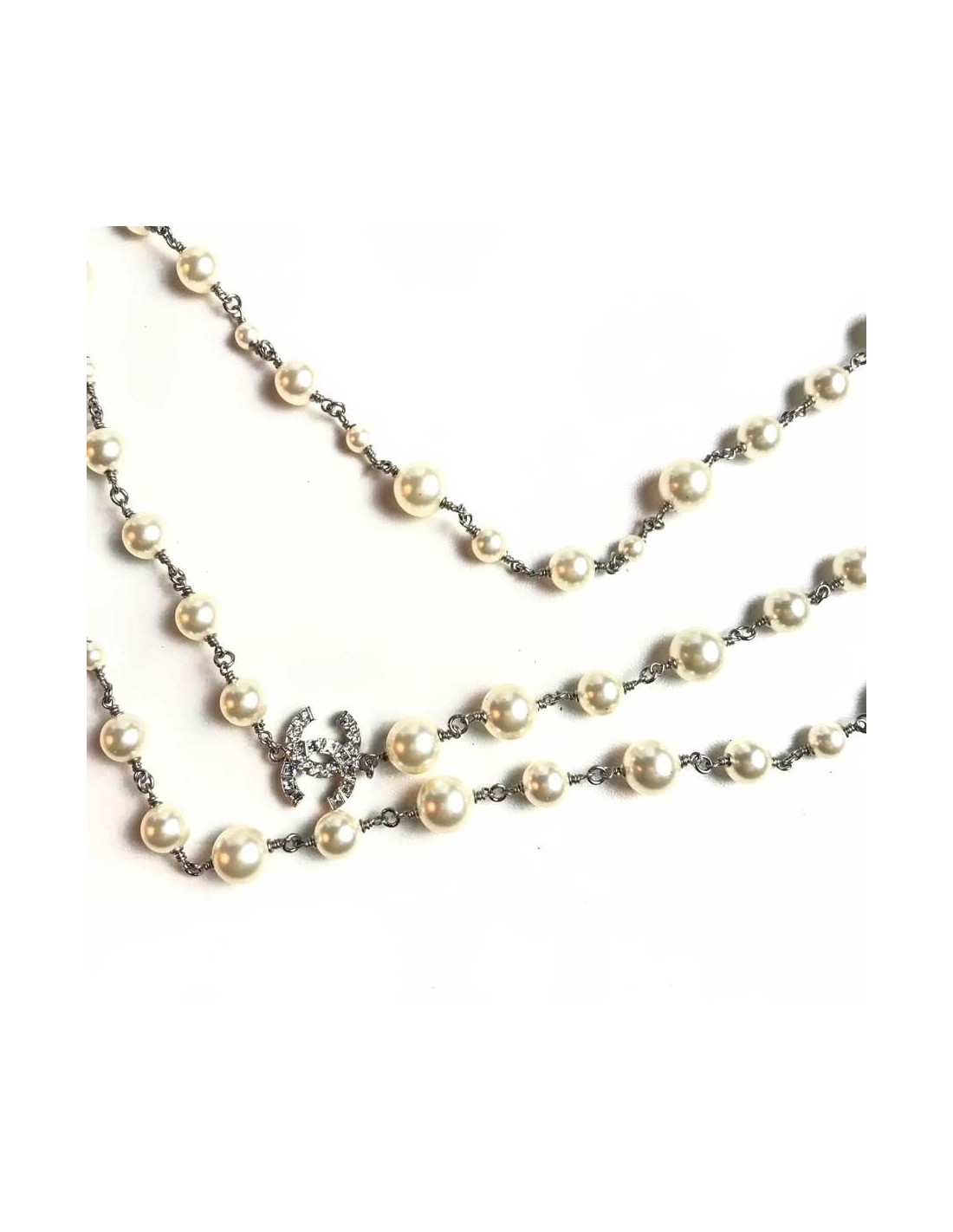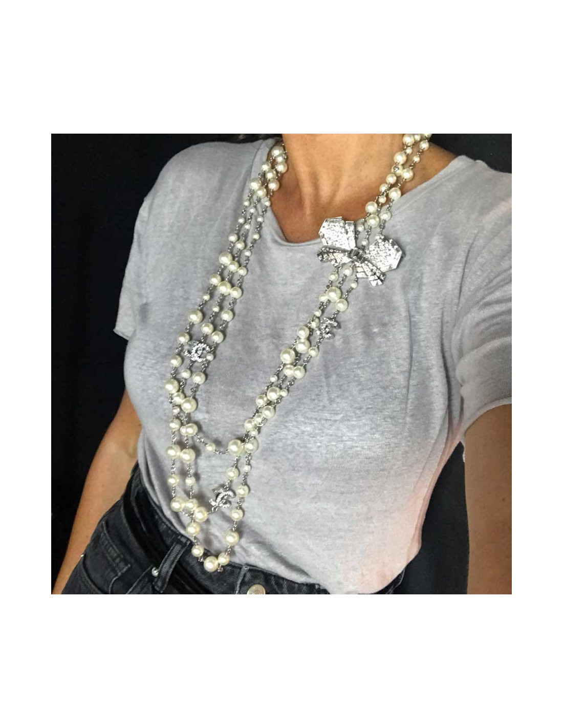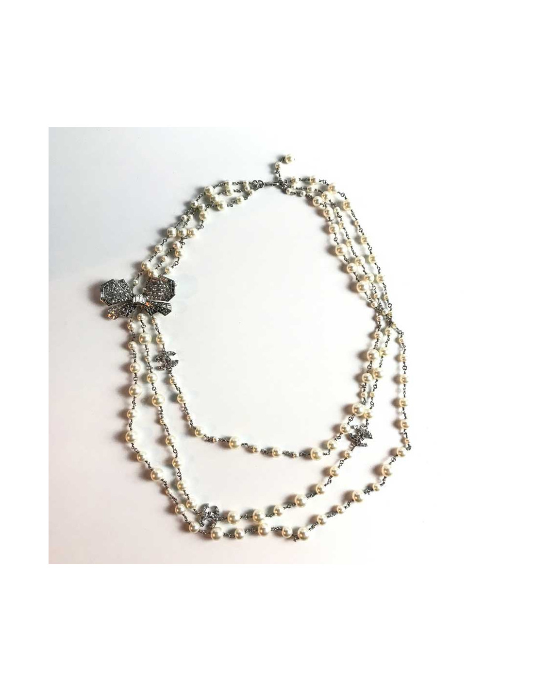 Le sautoir est issu de la maison CHANEL. Il représente trois rangées de perles couleur nacre, avec ça et là des emblèmes CC en strass. Le collier arbore un magnifique noeud papillon composé de strass de différentes tailles. Le noeud papillon comporte un crochet, permettant de bien le caler à votre vêtement.