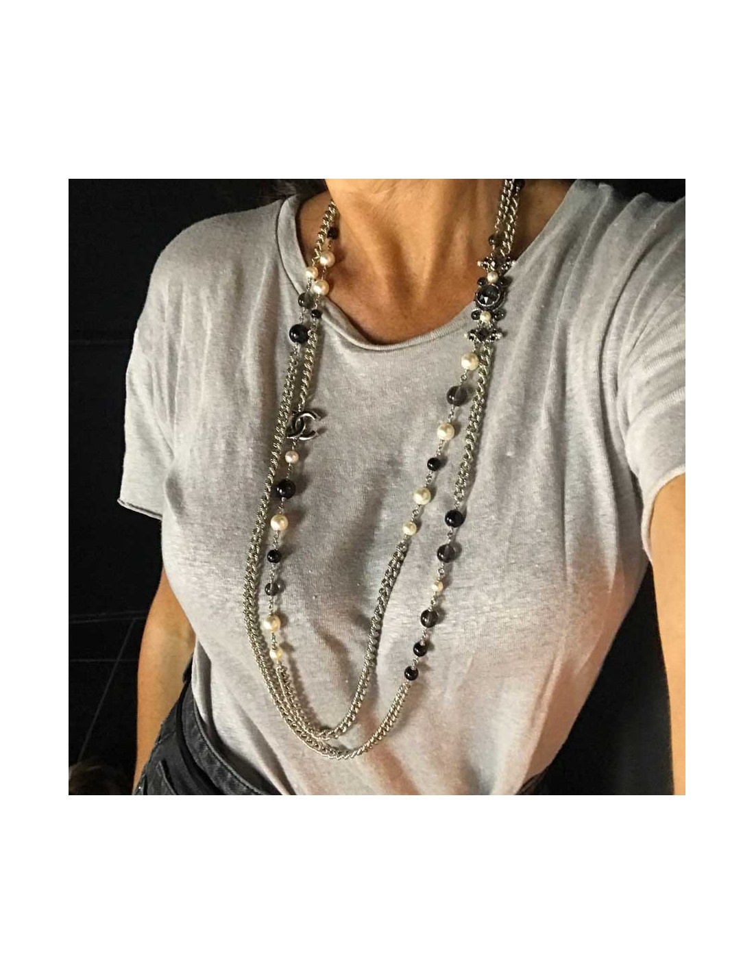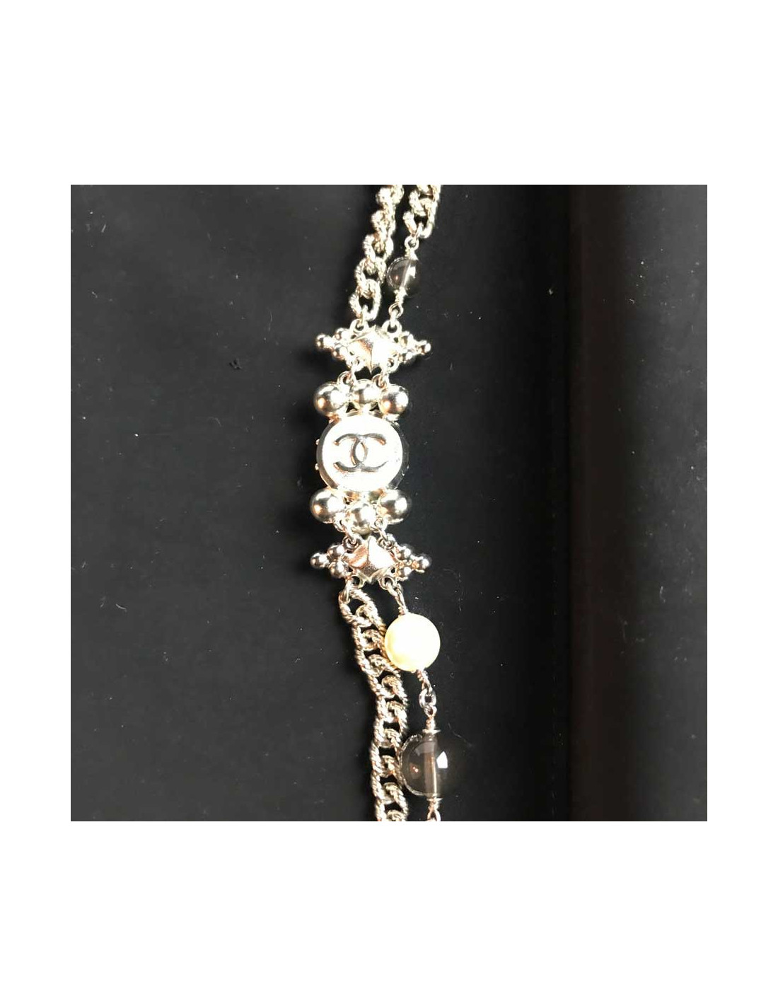 Sautoir Chanel CC argenté et perles