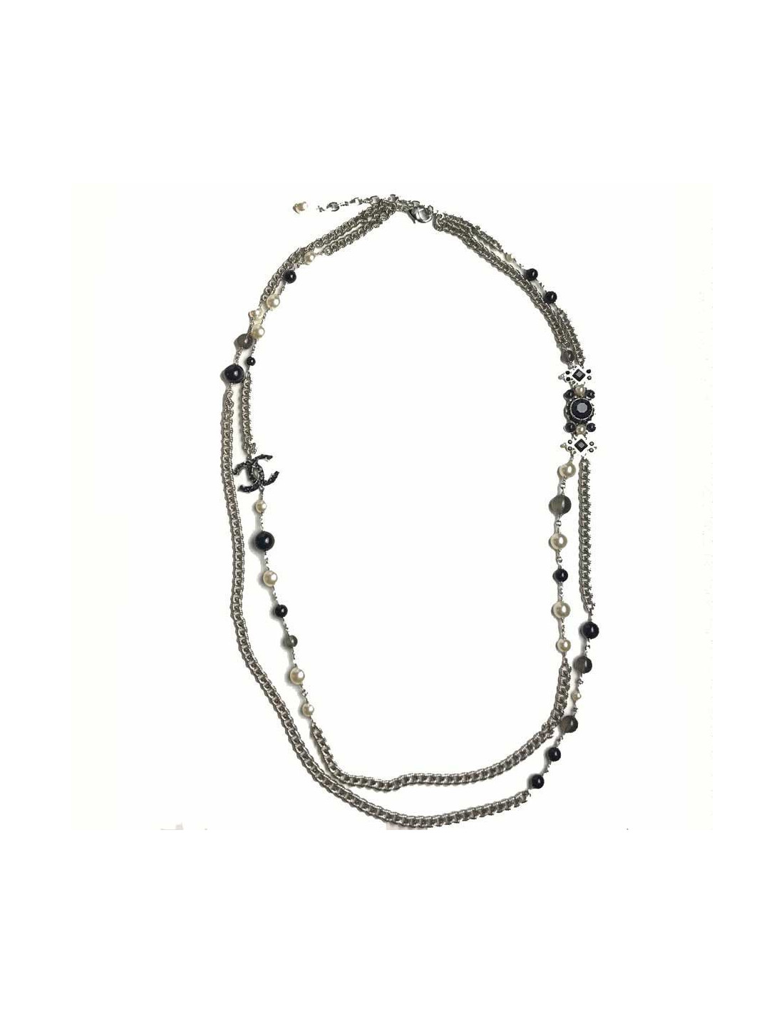 Le sautoir est issu de la Maison CHANEL. Sa chaîne est en métal argenté et comporte des perles nacrées, noires et grises transparentes. Le collier comporte également un CC en strass noir.