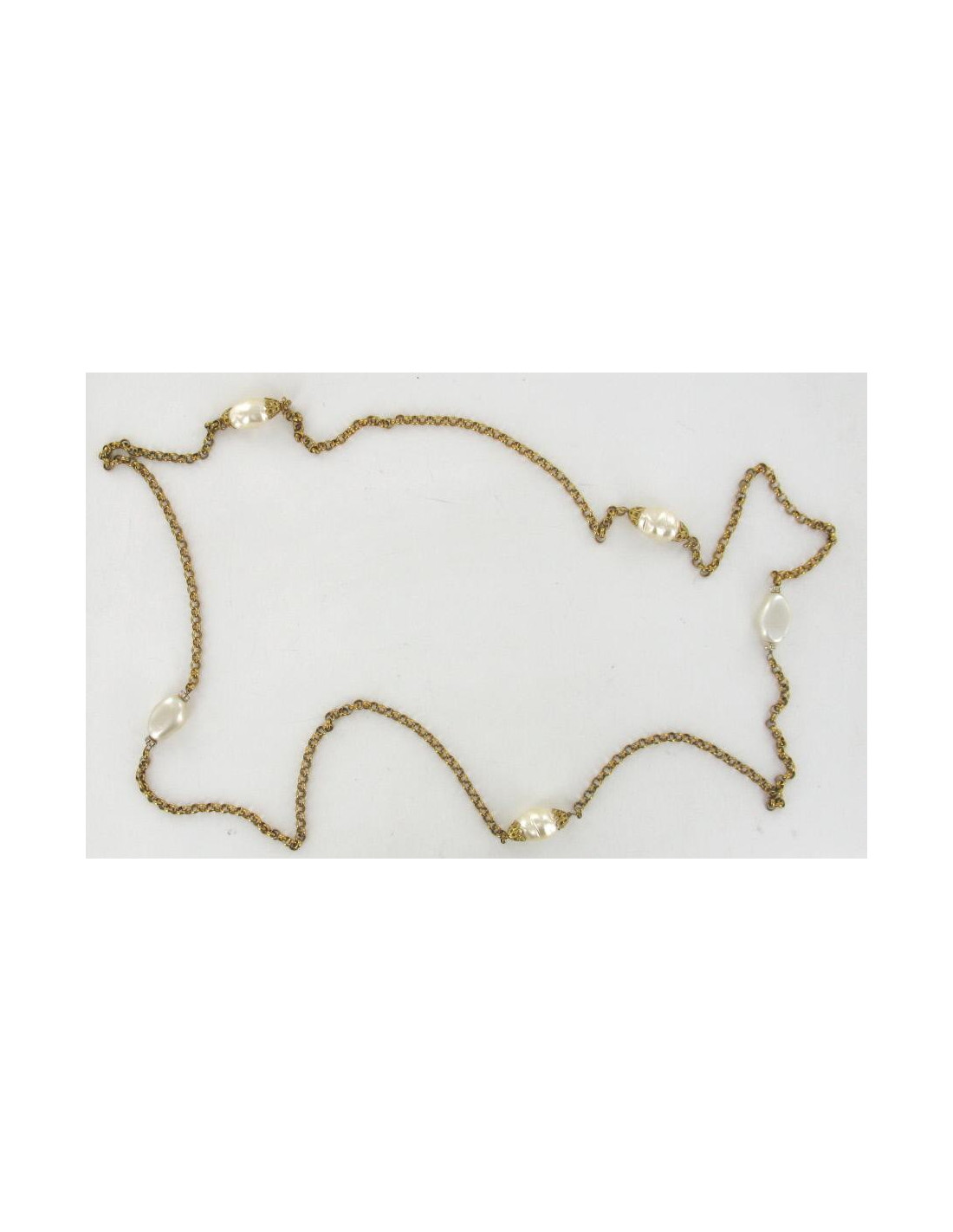 Sautoir Marguerite de Valois, chaine en métal doré vieilli et perles nacrées en pâte de verre de forme baroques, certaines perles sont serties de part et d'autres d'une couronne de strass blancs.