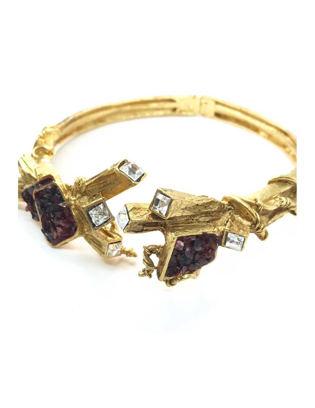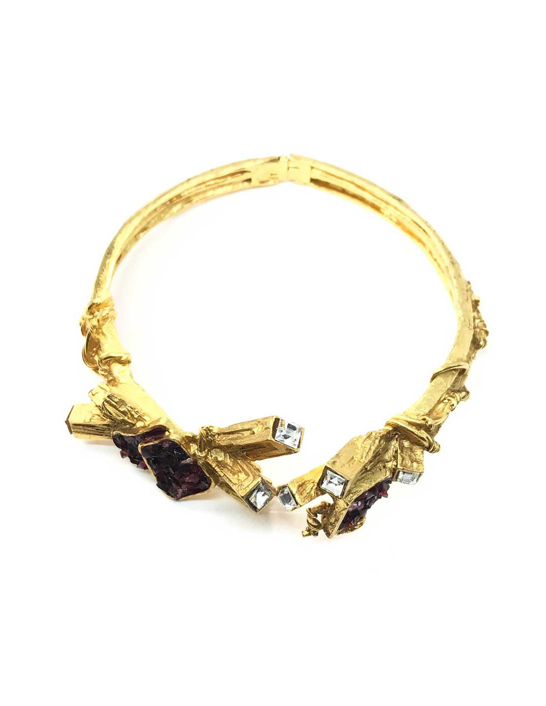 Vous pouvez retrouver ici tout le folklore du couturier CHRISTIAN LACROIX avec ce ras de cou couleur or, incrusté de cristaux bordeaux et de strass. Idéal pour mettre une touche sophistiquée à votre tenue. Ce collier est rigide.
