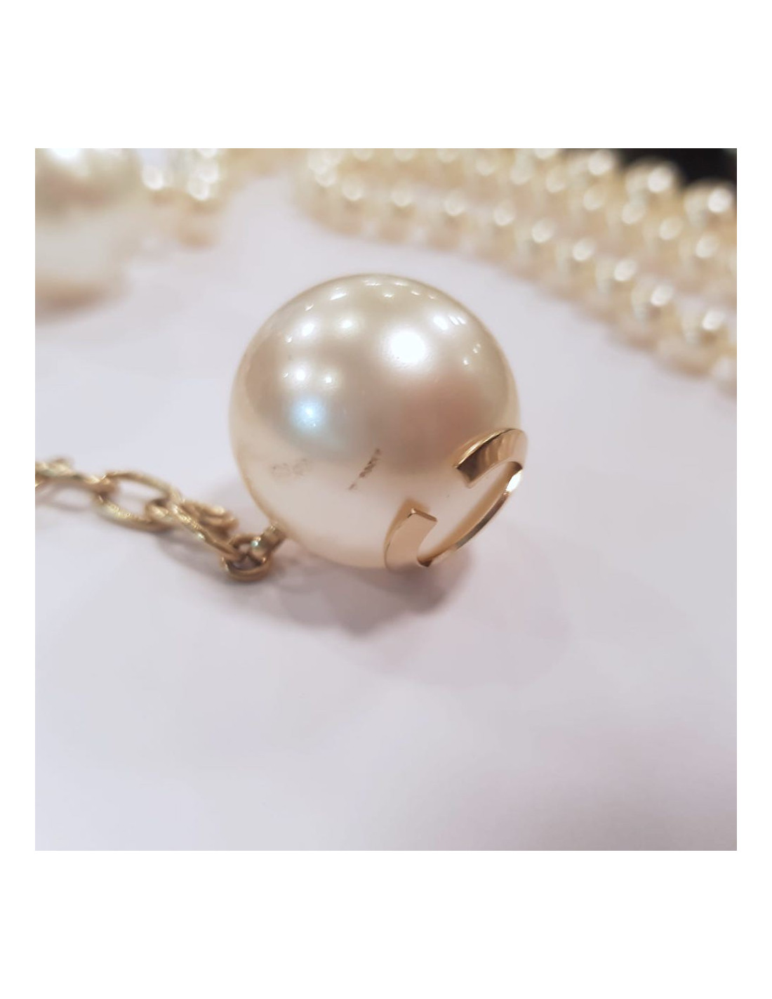 Ce sublime sautoir a été créé par la maison CHANEL. Il est composé d'un rang de perles de trois tailles différentes dont deux maxi-perles qui font l'originalité du collier. La dernière perle est ornée d'un double CC doré. Le sautoir CHANEL est un bijoux iconique de la maison parisienne. Gabrielle CHANEL aimait le marier à de simples marinières, à des vestes en Tweed ou même le porter sur une tenue de cavalière. Chez Valois Vintage Paris, nous voulons penser que ce collier, emblème du style Coco, accompagnera vos moments les plus précieux.
