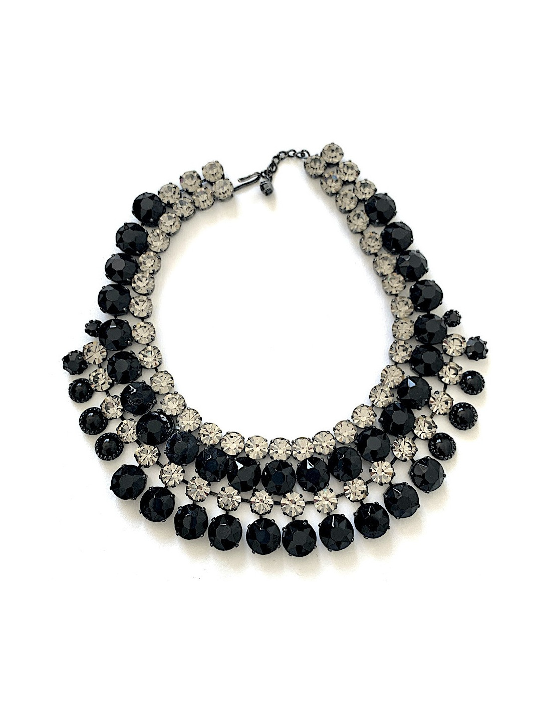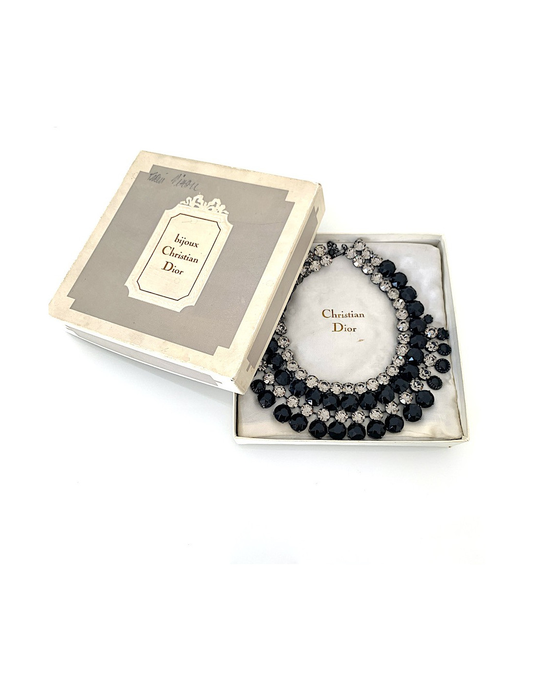 Plastron CHRISTIAN DIOR composé de 4 rangées de cristaux. Deux rangées de cristaux facettés blancs et deux rangées de cristaux facettés noirs de plus grande taille. Quelques pierres rondes terminent le plastron sur les extrémités.