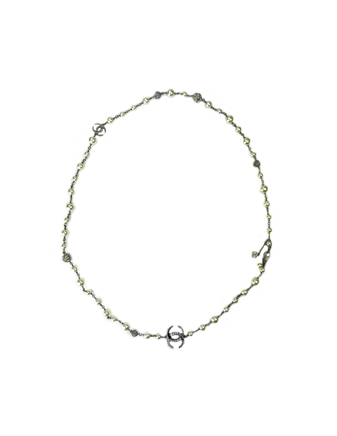 Le sautoir provient de la Maison CHANEL. Il se compose d'une longue chaîne sur laquelle s'entreposent des perles nacrées de différentes tailles, ainsi que des petites boules en strass, pour certaines avec le logo CC de la marque. La chaîne présente par ailleurs deux CC en strass, l'un de petite taille et l'autre de taille plus importante. La sautoir se termine par deux toutes petites chaînes, l'une comportant le logo CC, l'autre une petite perle nacrée.