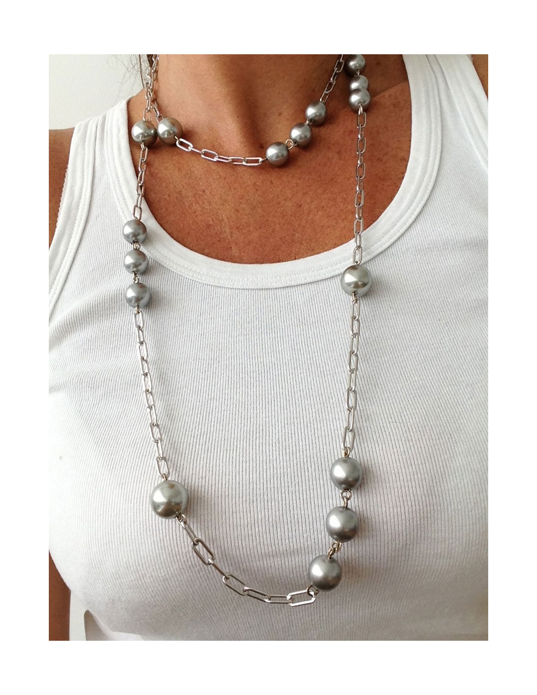 Élégant sautoir Marguerite de Valois en perles nacrées grises et chaine en métal argenté.