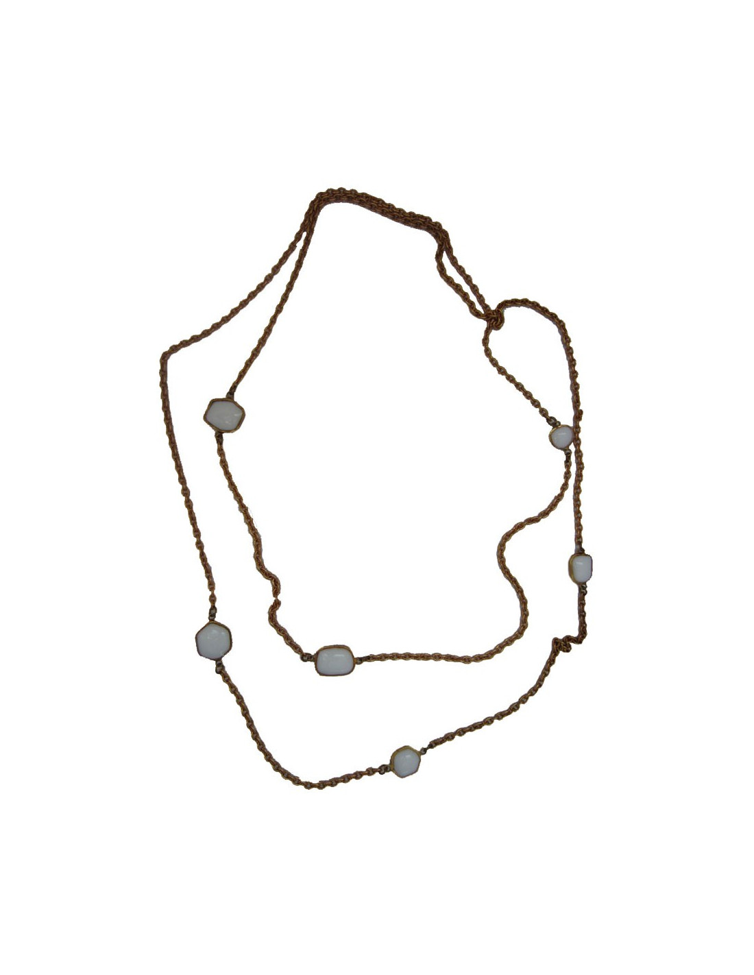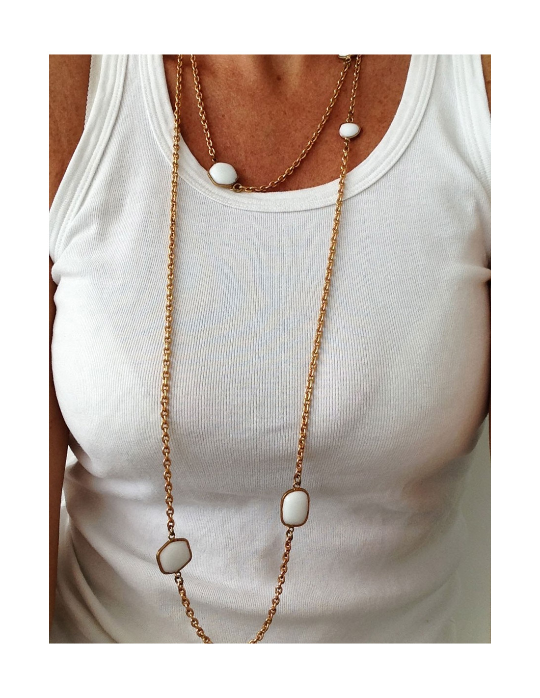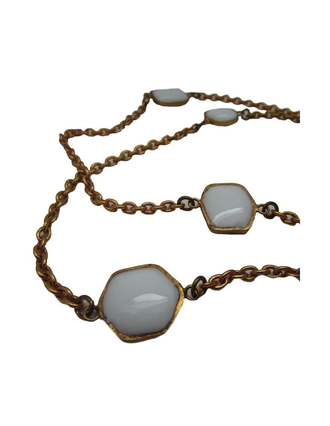 Issu de la Collection très couture "Légende" de Marguerite de Valois, ce sautoir est orné de pièces de cuivre à la découpe irrégulière remplies de pâte de verre blanche et montées sur une chaine en métal doré à l'or fin.