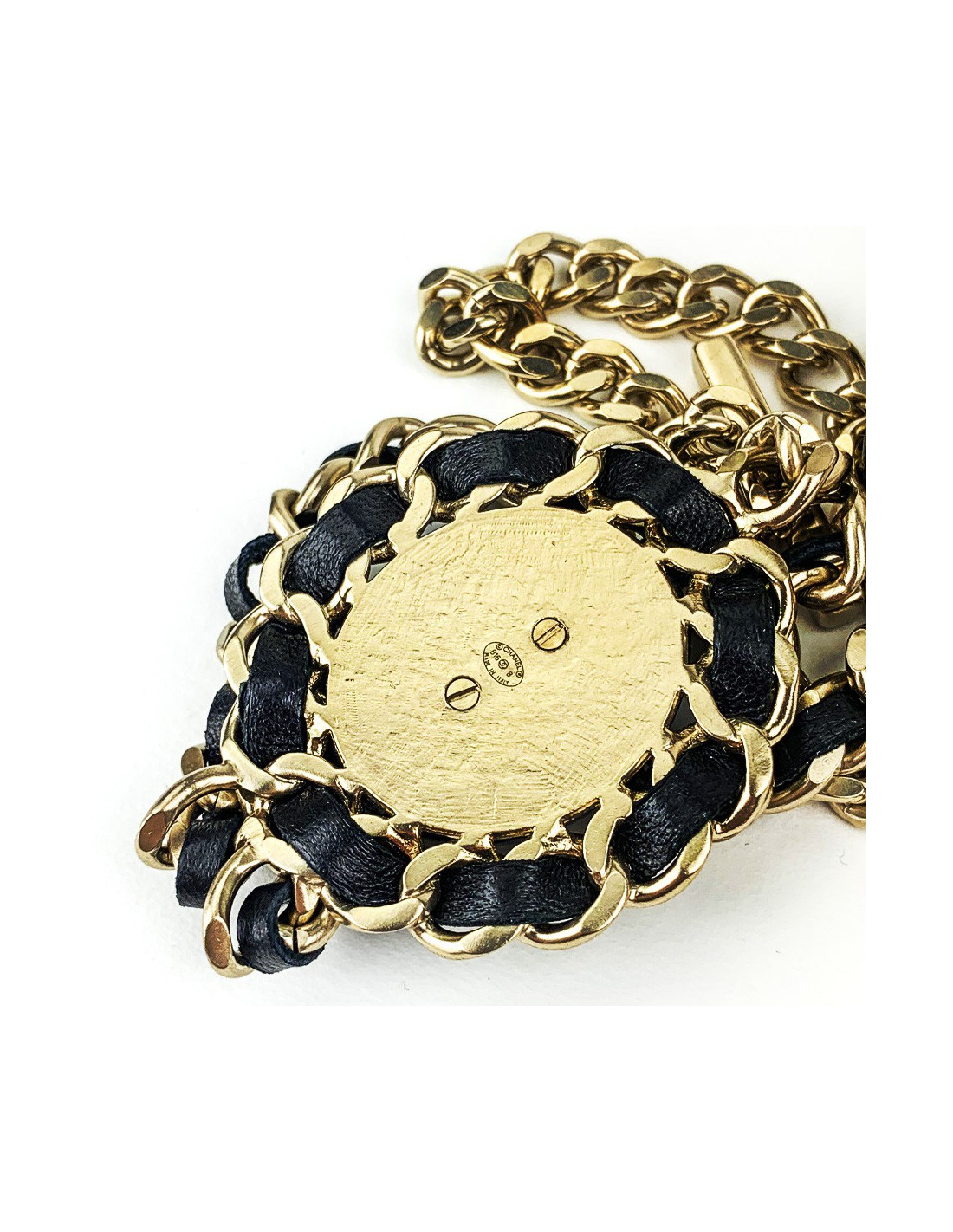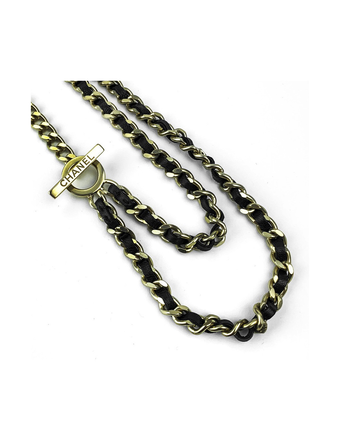 Le sautoir est un CHANEL. Son élément central est un ovale en cuir noir comportant l'emblème CC. D'un côté du CC part une chaîne dorée, de l'autre, deux chaînes argentées entrelacées de cuir noir. Les trois chaînes se rejoignent vers un fermoir chaîne d'ancre.