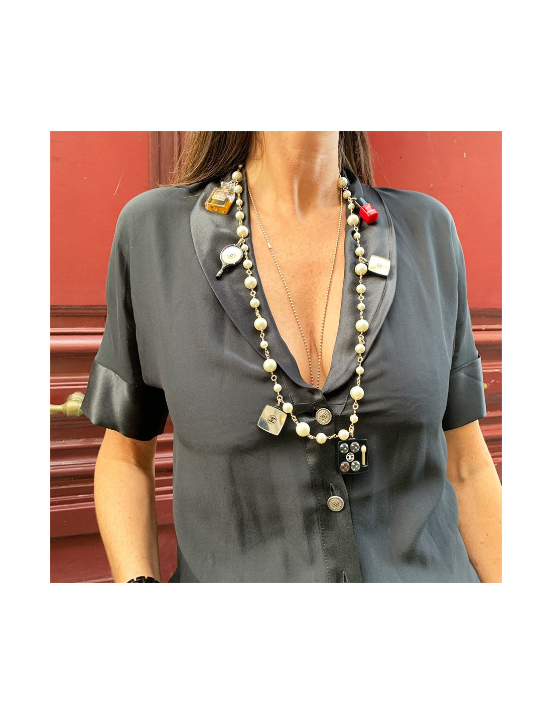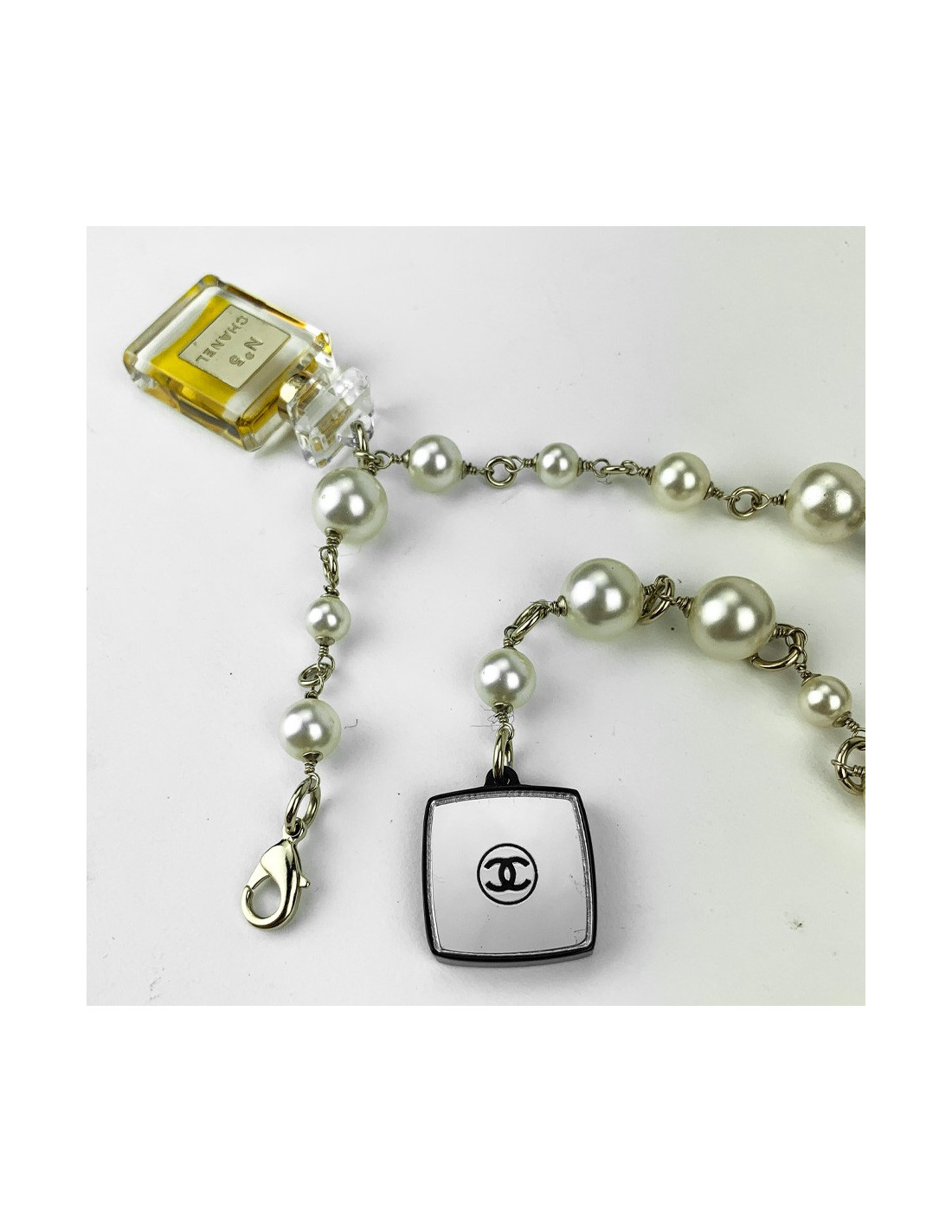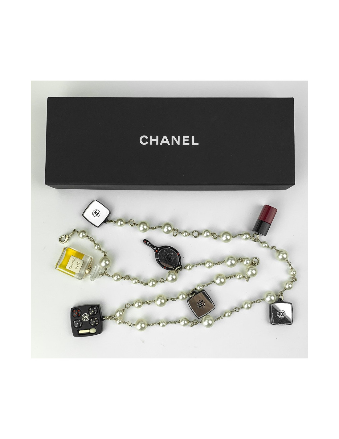 Le sautoir est signé de la Maison CHANEL. Il représente une longue succession de perles de différentes tailles, où s'entreposent ça et là des charms de beauté CHANEL: un flacon de N°5, 4 miroirs, une palette à maquillage, un vernis rouge.
