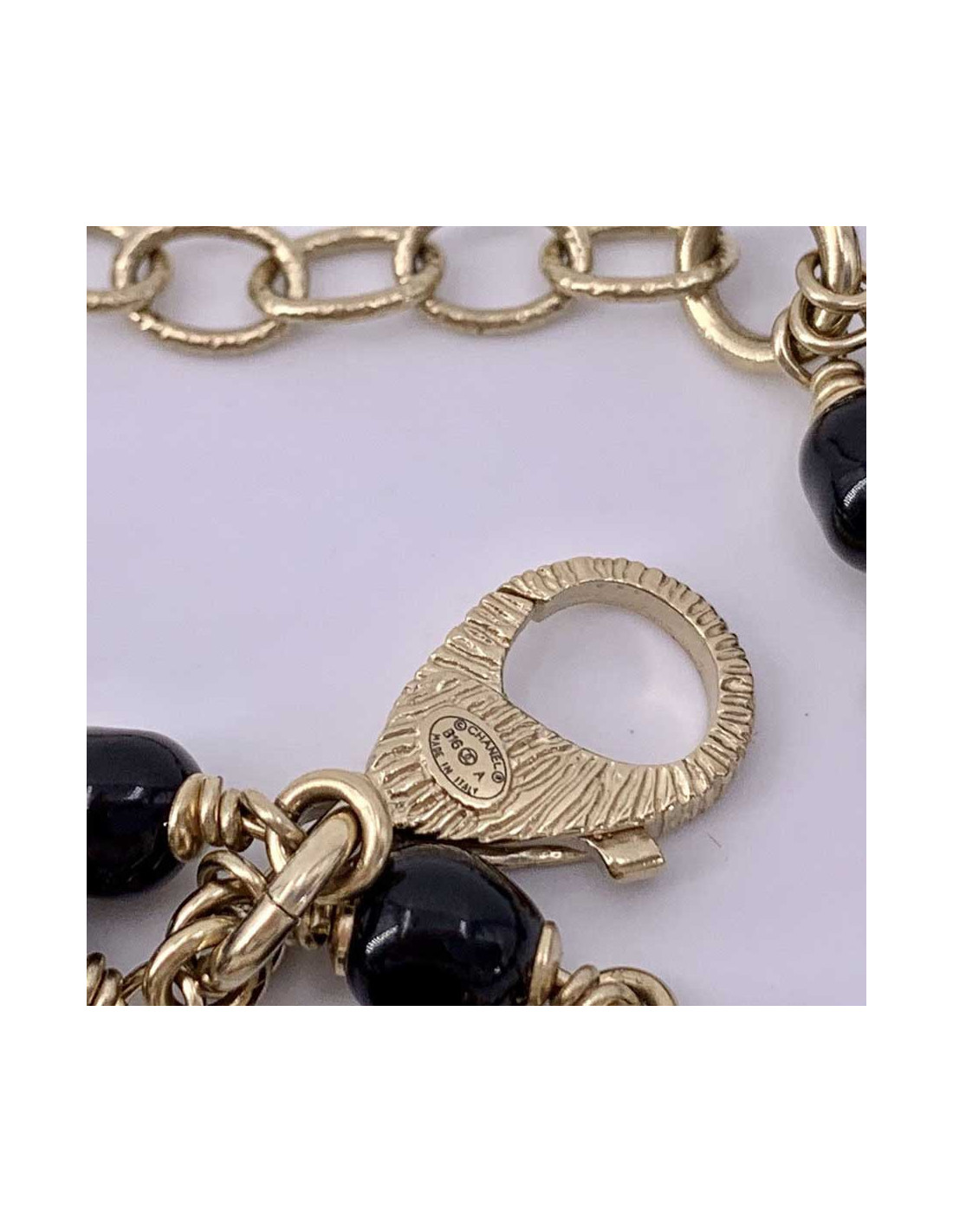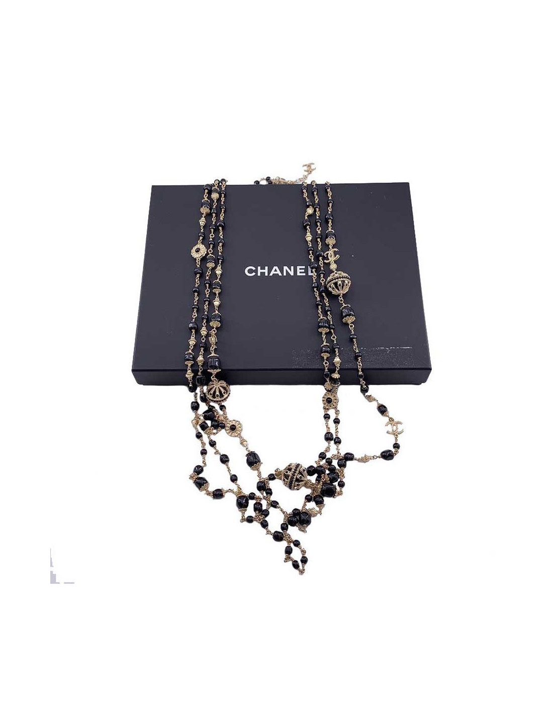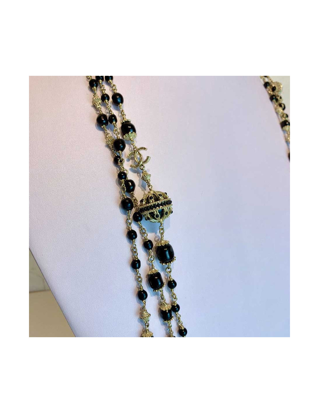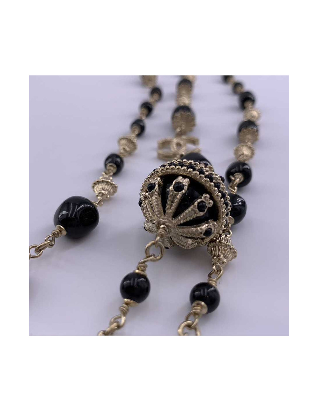 Le collier est de la Maison CHANEL. Il se présente sous la forme d'un triple rang de chaîne en métal doré à l'or fin, chacune sertie de perles noires de tailles et formes différentes. Nous découvrons par ailleurs deux boules noires serties elles aussi de petites perles, ainsi que des CC en métal doré de part et d'autre du sautoir.