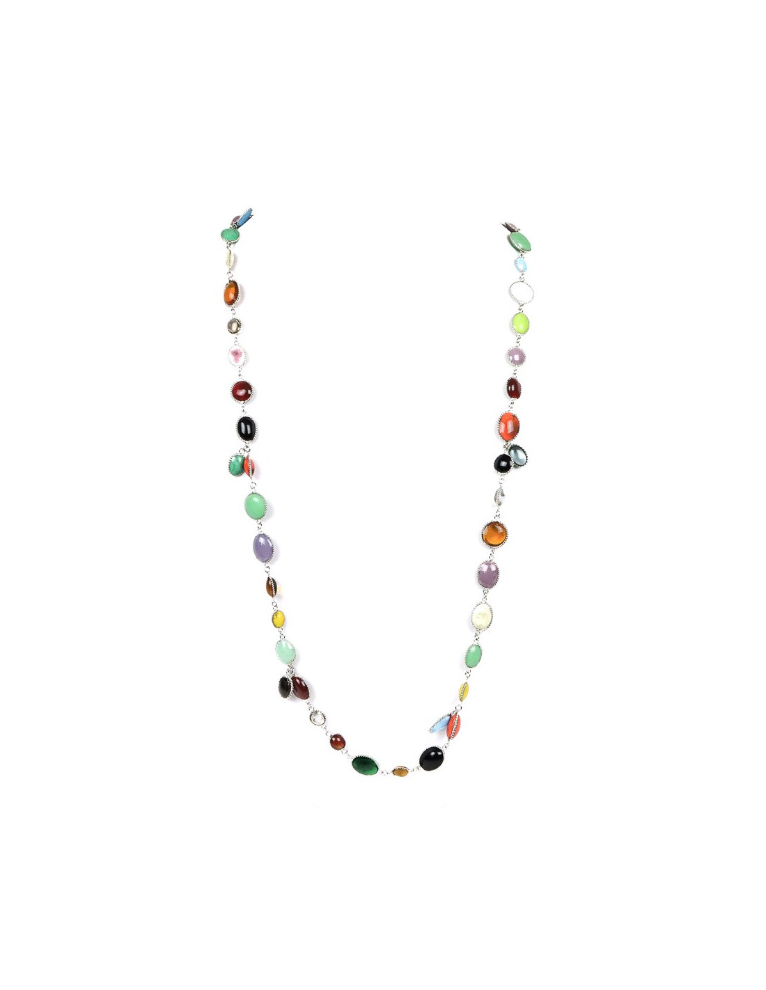 Le sautoir est de la Maison Marguerite de Valois, dont les artisans français on travaillé pendant plus de 40 ans pour les plus grands créateurs. La Maison nous propose ici un magnifique sautoir en métal argenté sur lesquel se répartissent des cabochons de résine en pâte de verre multicolore. Nous trouvons ainsi des cabochons bleus, rouges, noirs, verts, violets et orange.