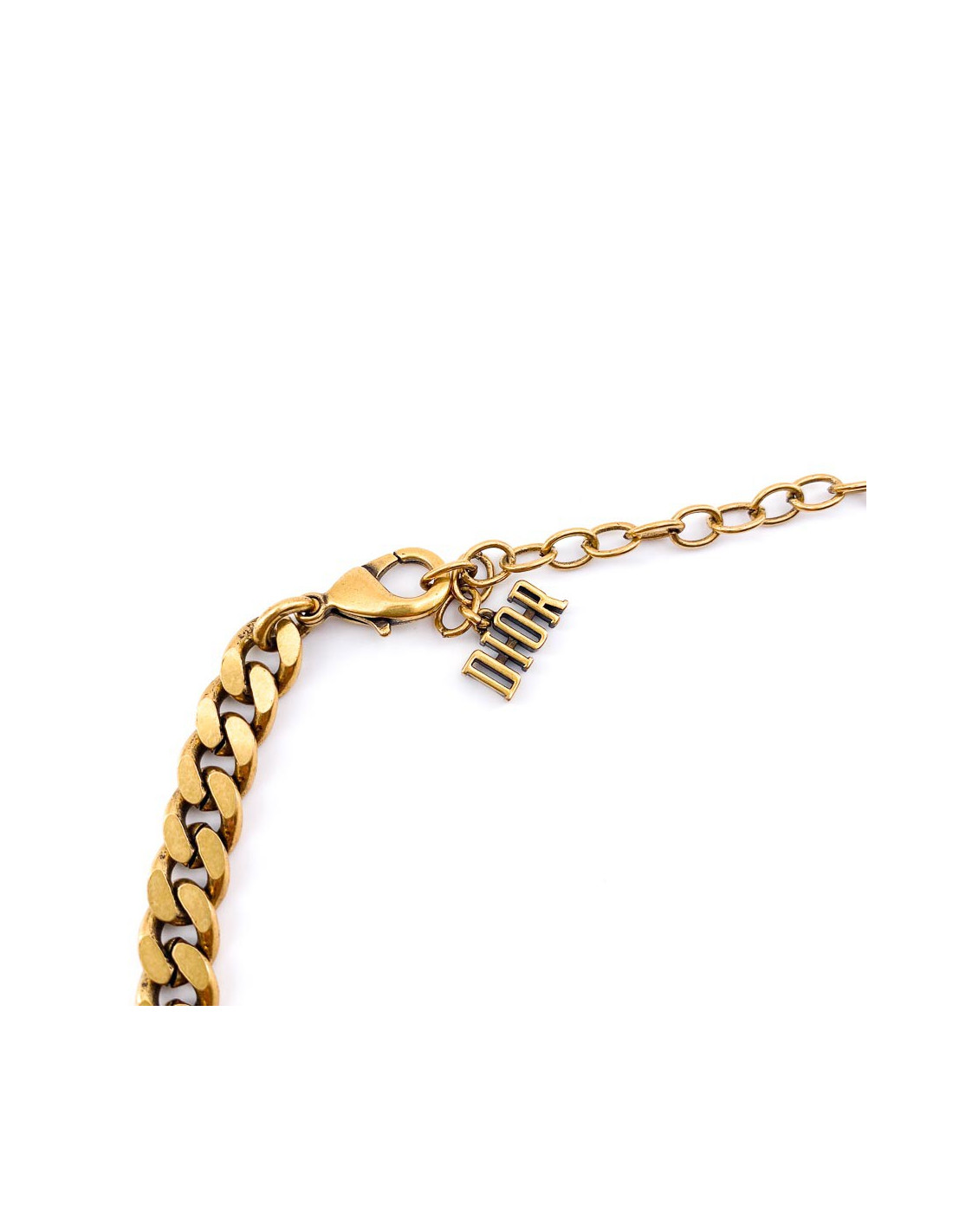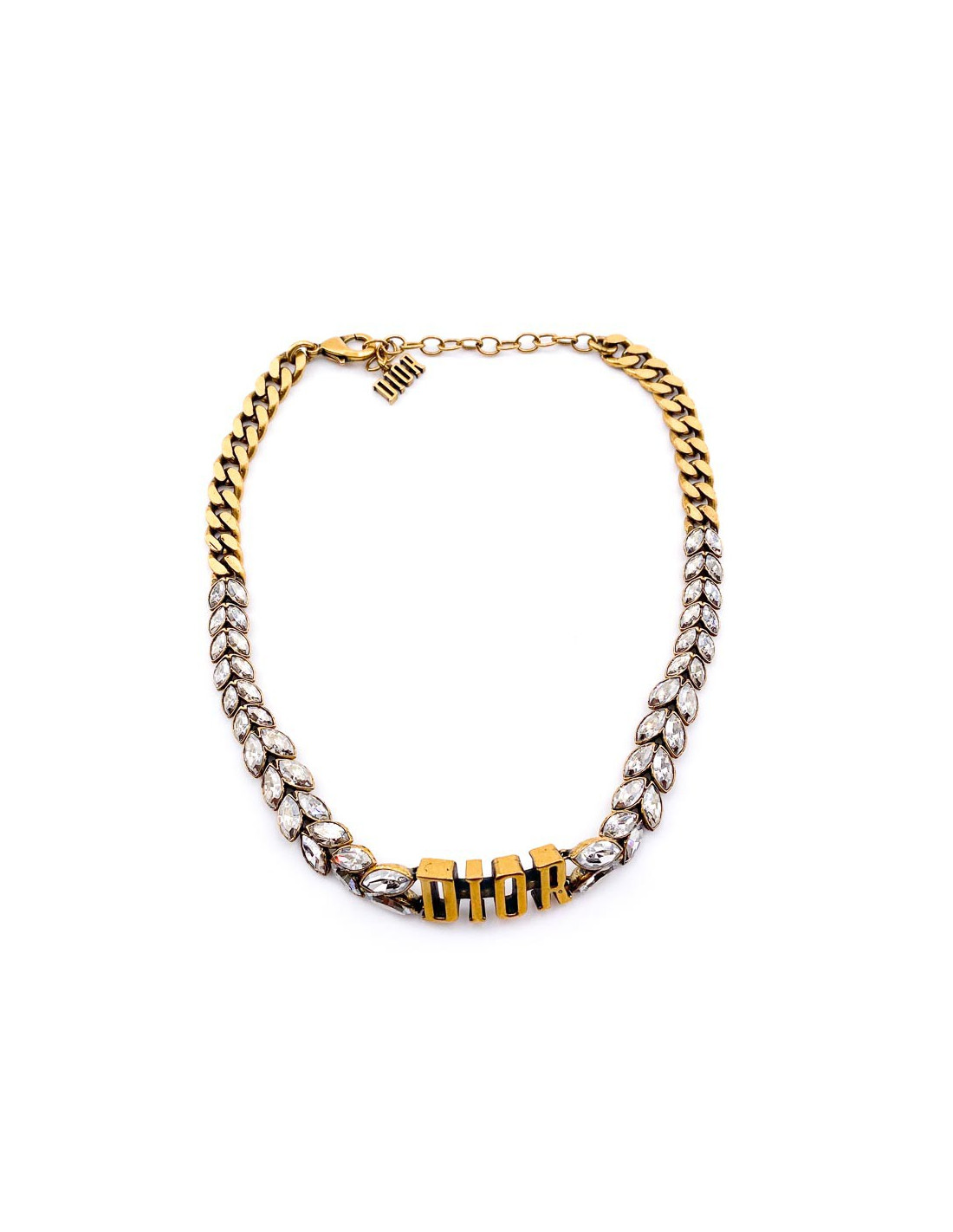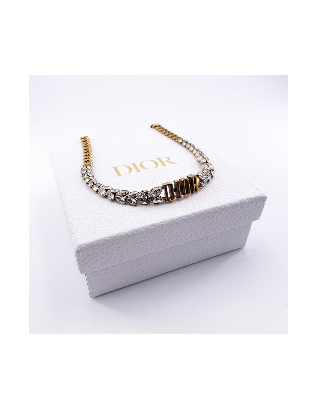 Le collier est de la Maison DIOR. Il se compose d'une chaîne en métal doré vieilli, sertie de strass. L'inscription DIOR prend place au centre du collier. Le bijou est à porter avec les créoles DIOR ref 28624. Retrouvez tout l'esprit DIOR dans ce bijou !