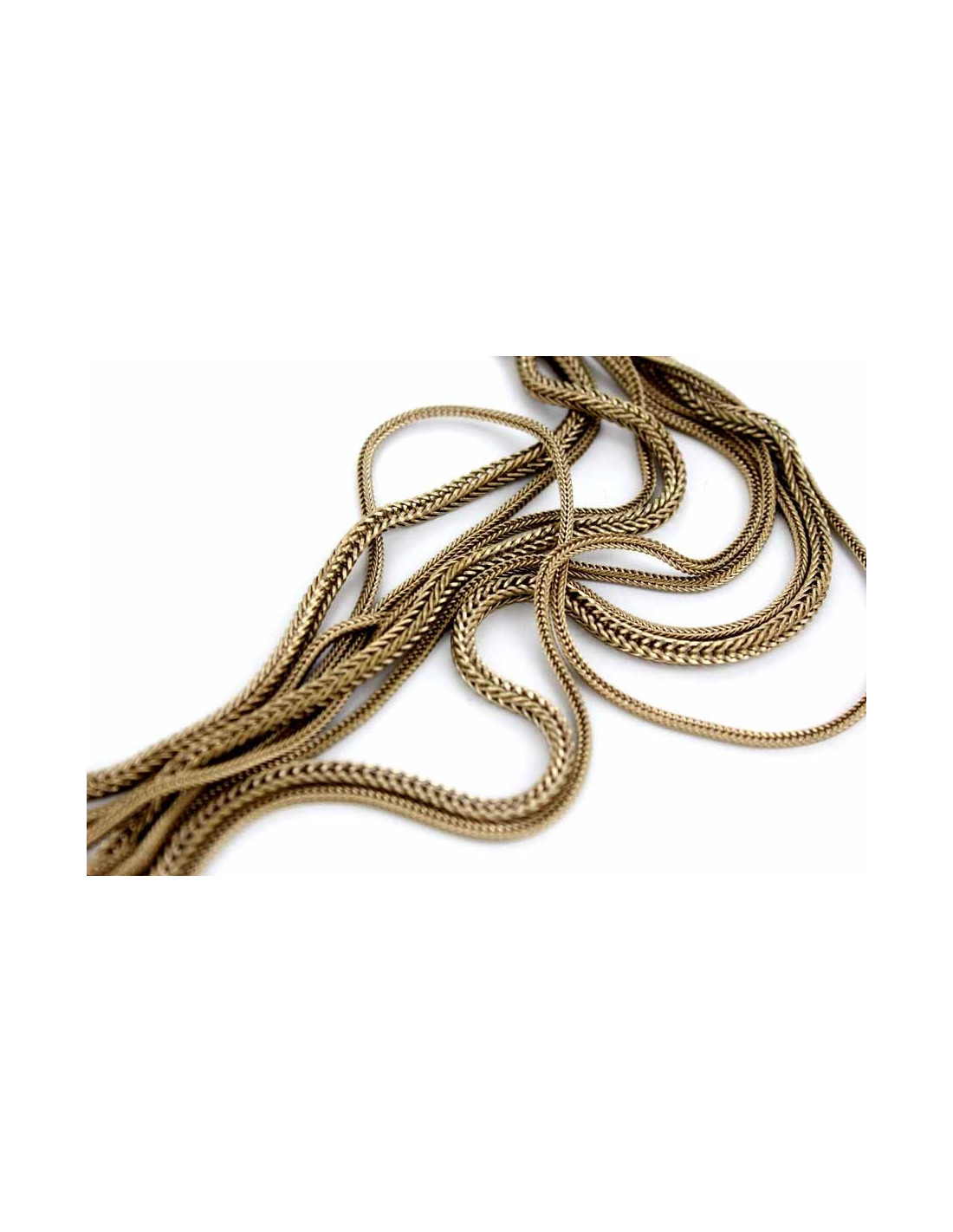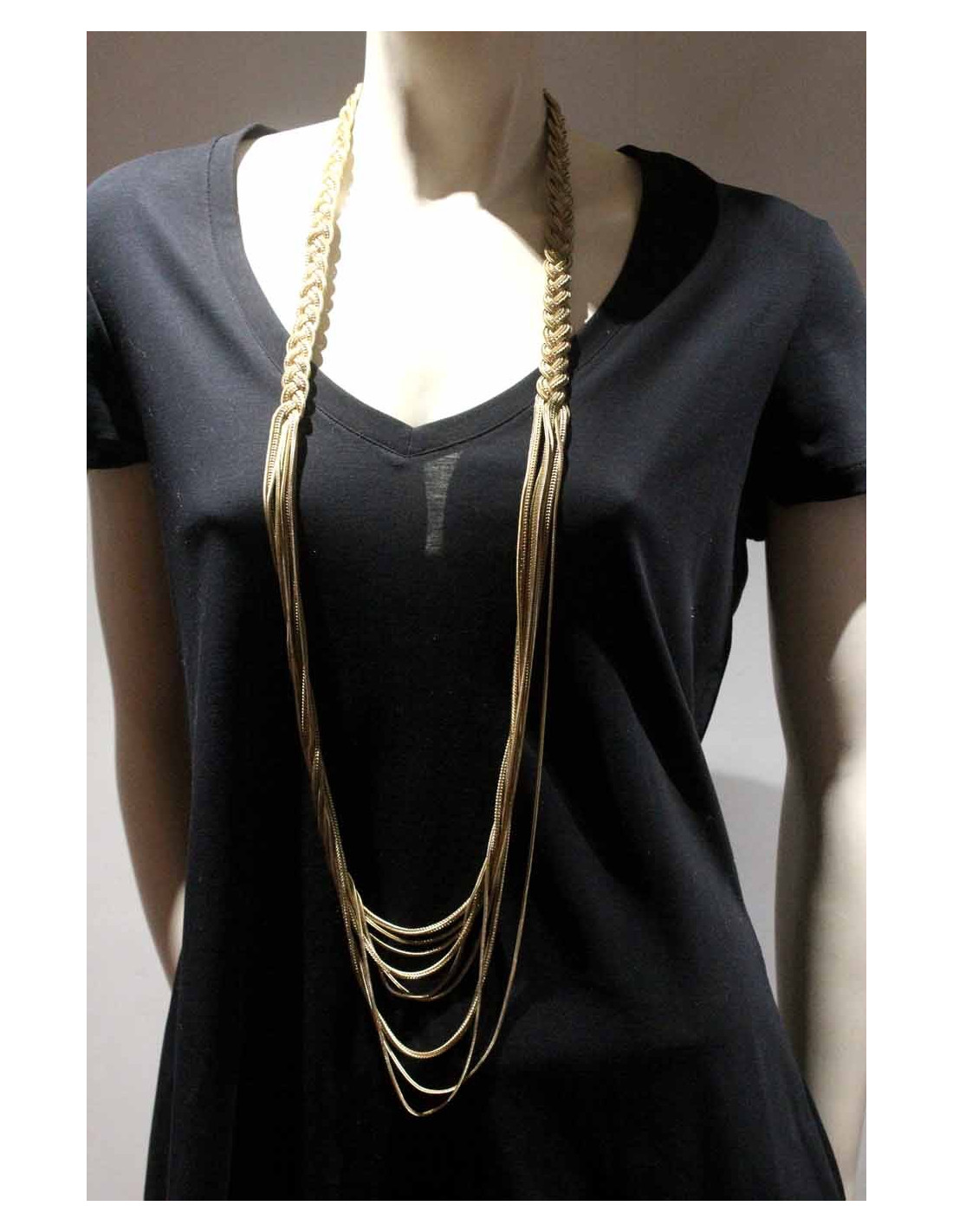 Ce sautoir en multi-chaînes est tressé sur le tour de la nuque.