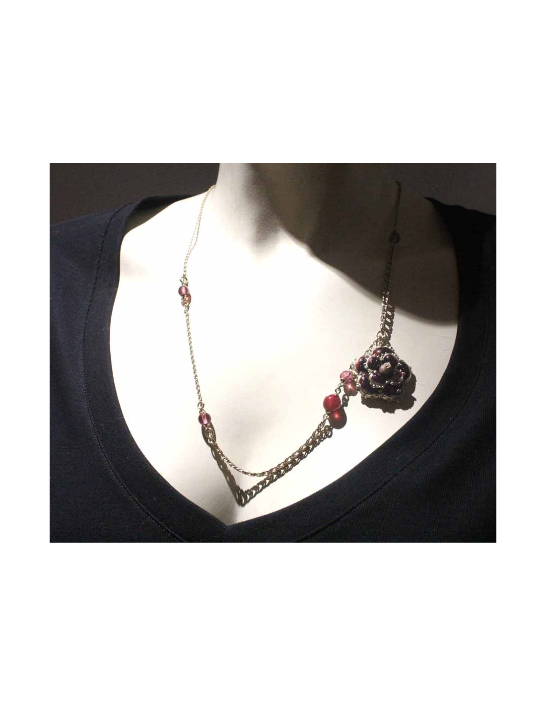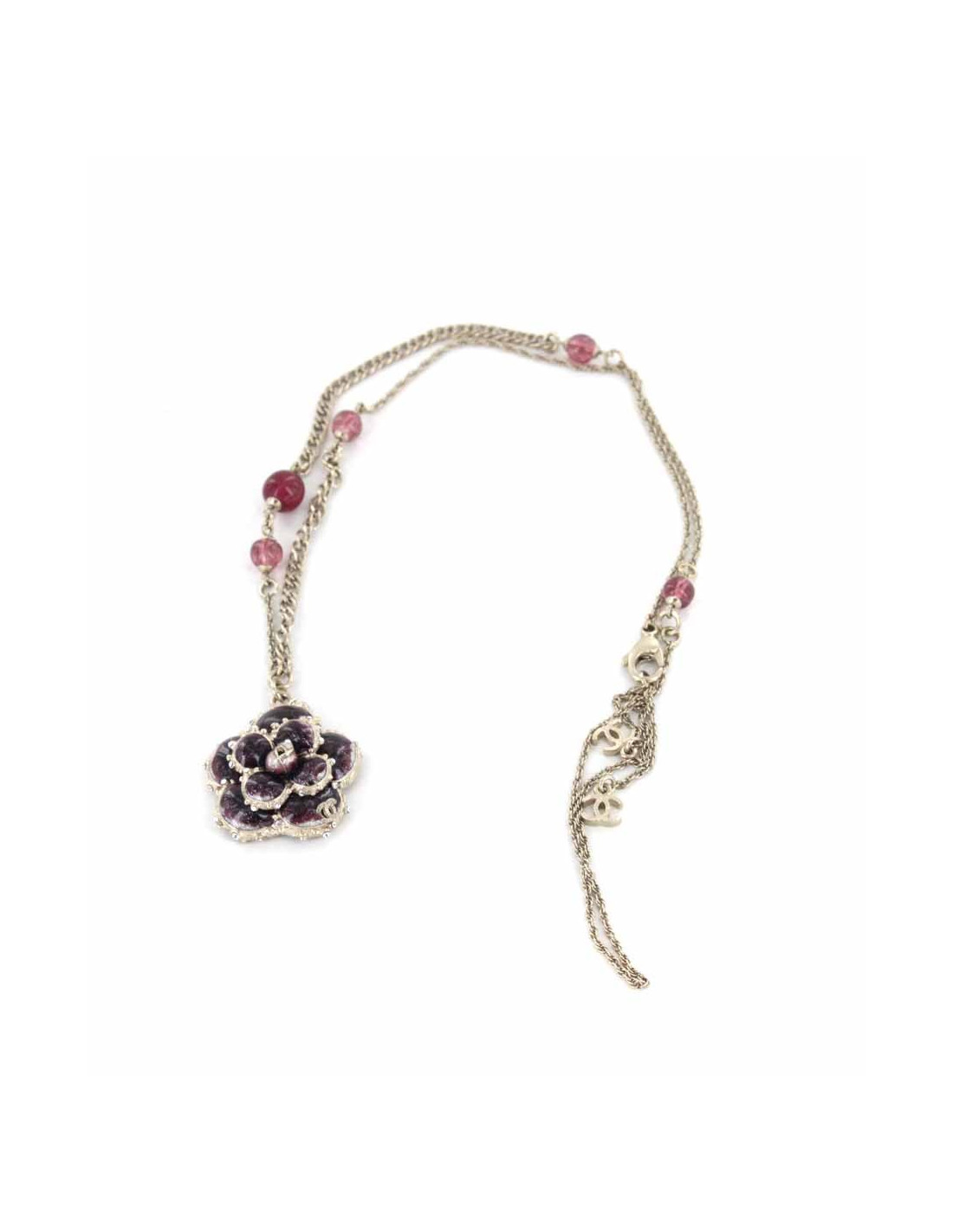 Ce superbe collier est composé de deux types de chaînes, une plus fine que l'autre, et de bjoux (perles et camélia) émaillés grenat.