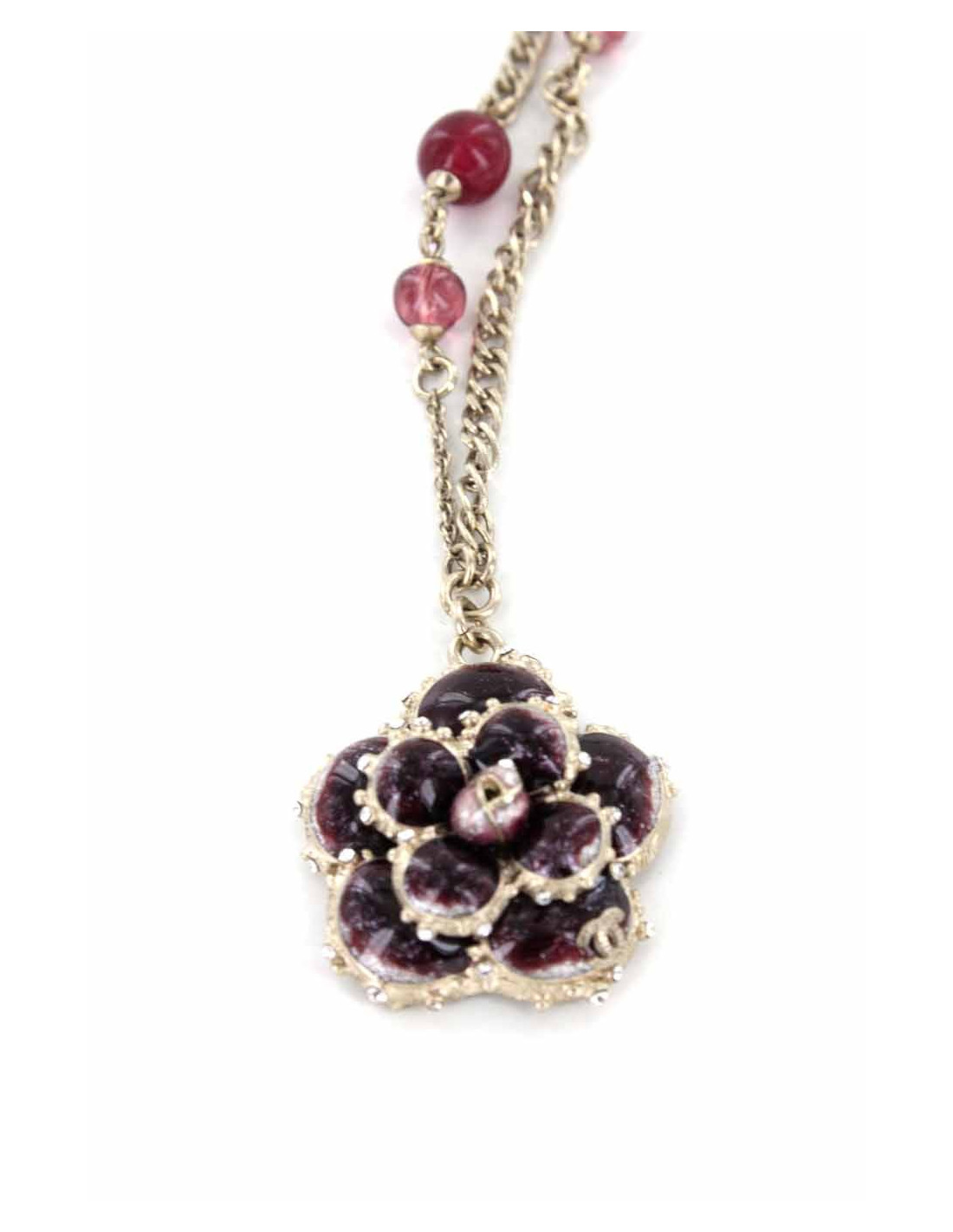 Collier CHANEL camélia en métal doré, bijoux émaillés grenat et strass.