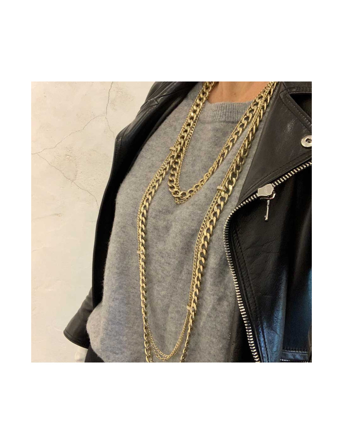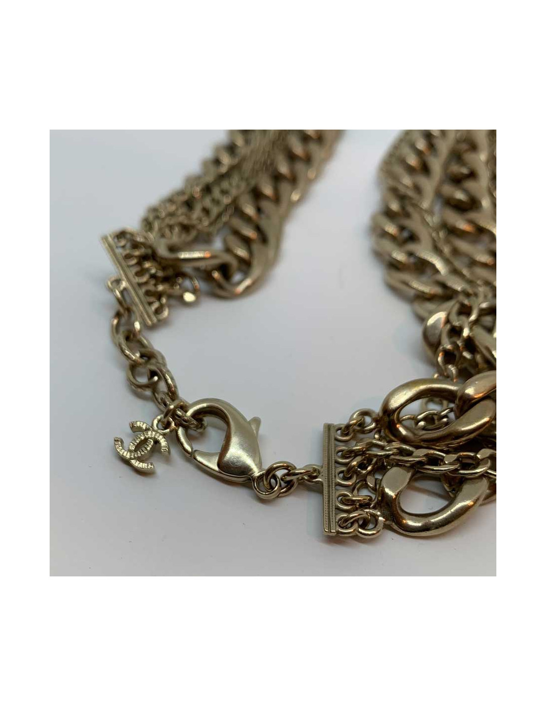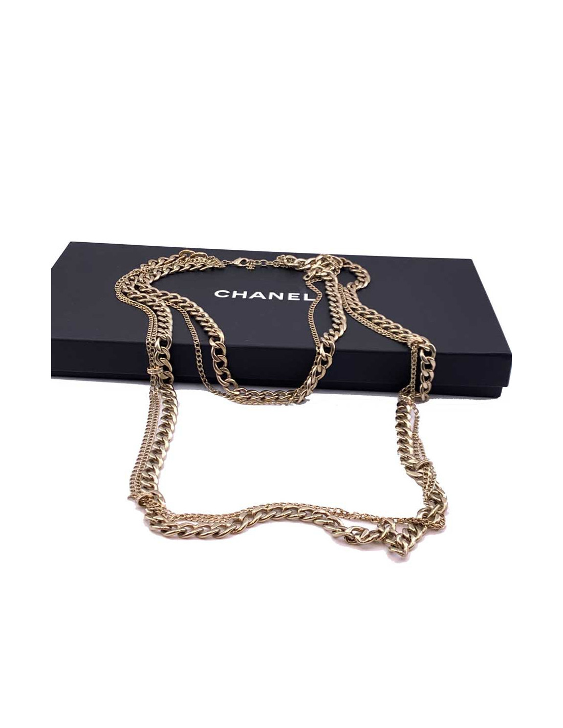 Magnifique pièce de chez CHANEL. Long sautoir composé d'un double rang de multi-chaînes de taille variées en métal doré à l'or fin et rassemblées par des anneaux sertis de strass.