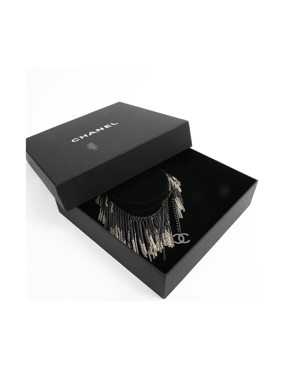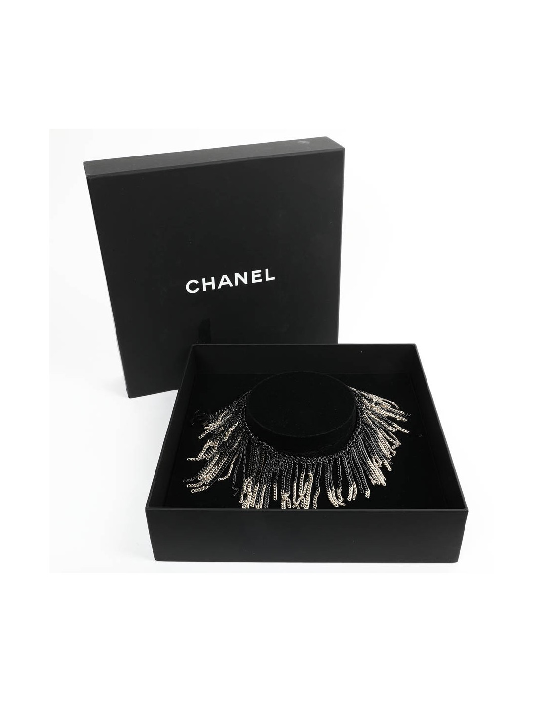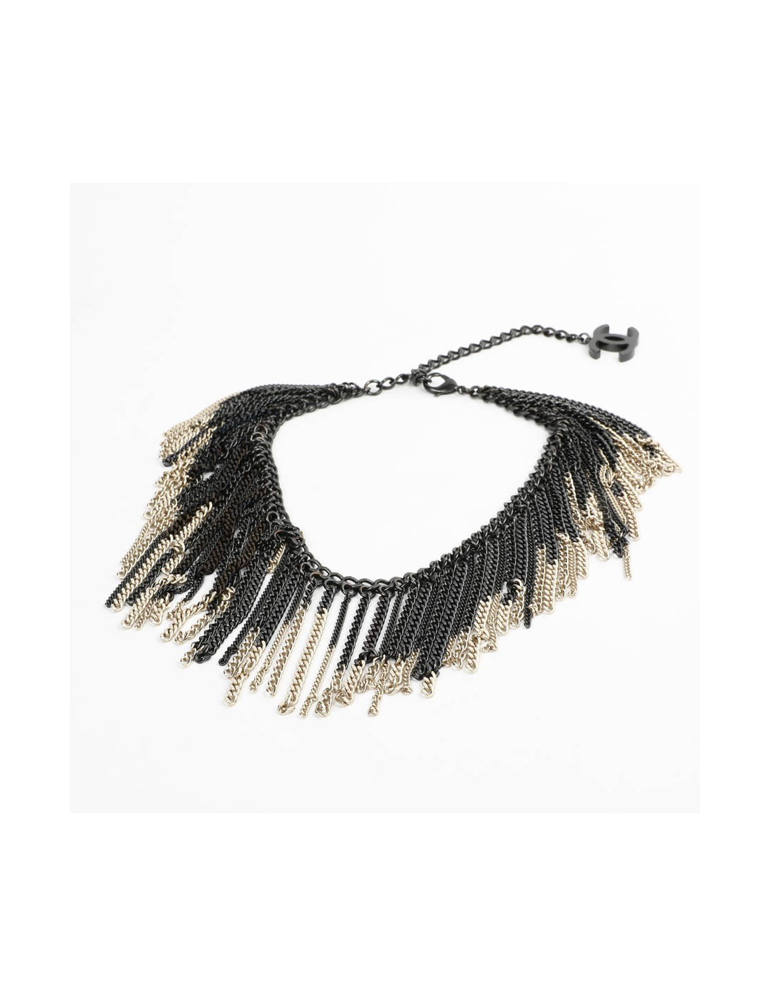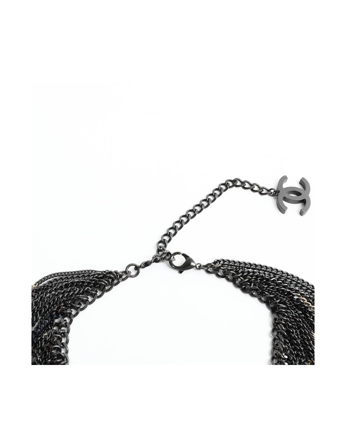 Collier CHANEL chaînes ruthénium et doré. Jamais porté. Se porte sur un décolleté. Présence de la pastille de la marque.