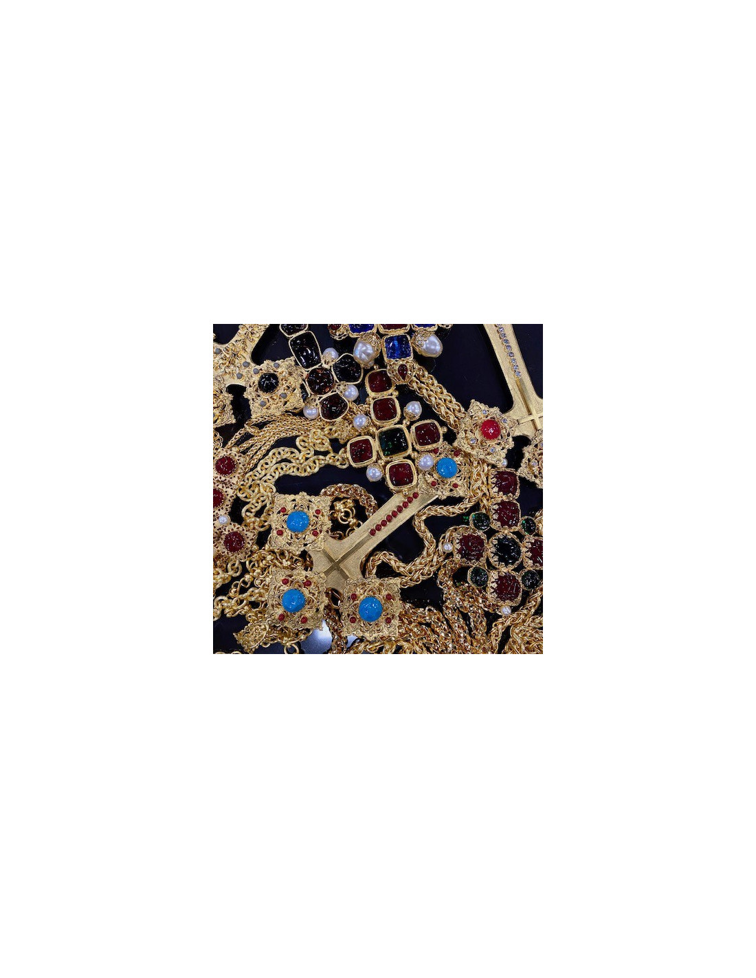 Nouveau Vendu COLLIERS - SAUTOIRS Pâte de verre MARGUERITE DE VALOIS sautoir croix MARGUERITE DE VALOIS 38980 1 800,00 € Pâte de verre MARGUERITE DE VALOIS sautoir croix Condition : très bon étatMatière : métal, pâte de verre, strass taille baguetteCouleur : centre rubis, saphirBijouterie : doré Mesures : 8 x 6 cm, longueur totale 132 cmDétails : bijou fabriqué entièrement à la main. Pâte de verre Voir