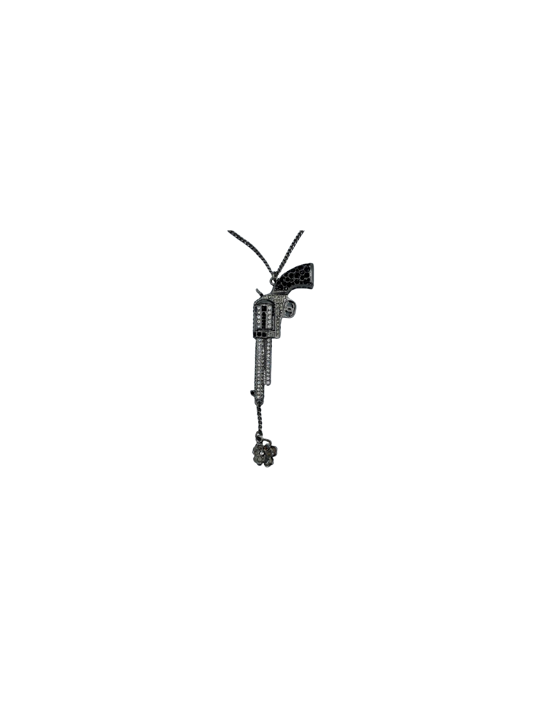 Ce collier en métal ruthénium avec des strass noir et blanc, est issu de la collection Chanel Métiers d'Art Paris-Dallas en 2014. La chaîne du collier est ajustable au bout du canon pend un petit camélia, fleur fétiche de Coco Chanel. Présence de la pastille sur le fermoir.