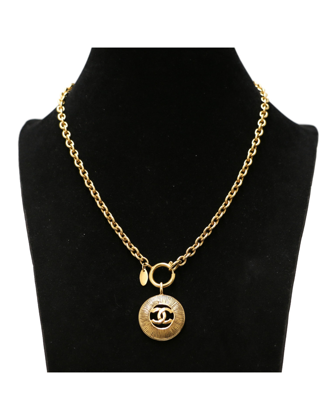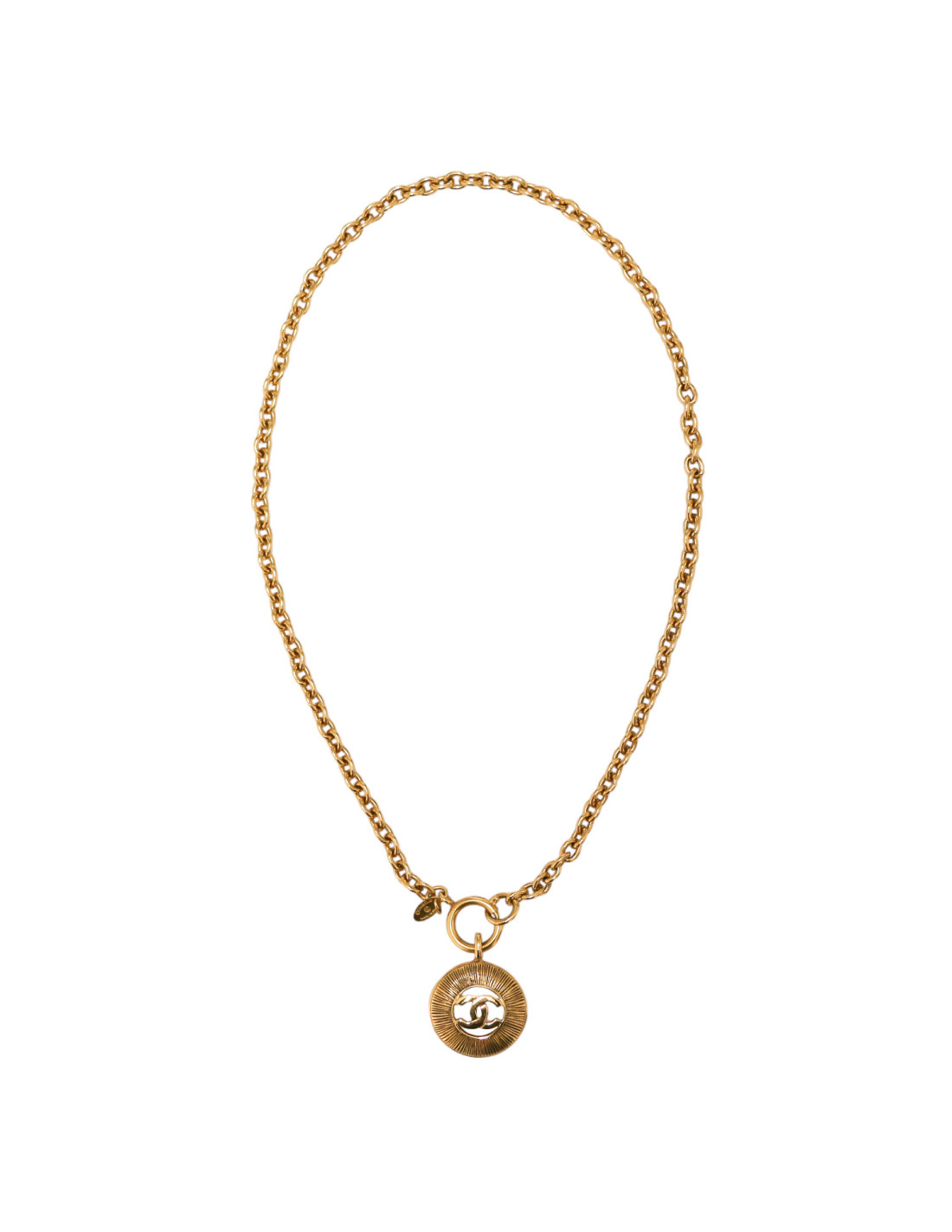 Détails : collier vintage avec son pendentif strié rond avec au centre un CC.