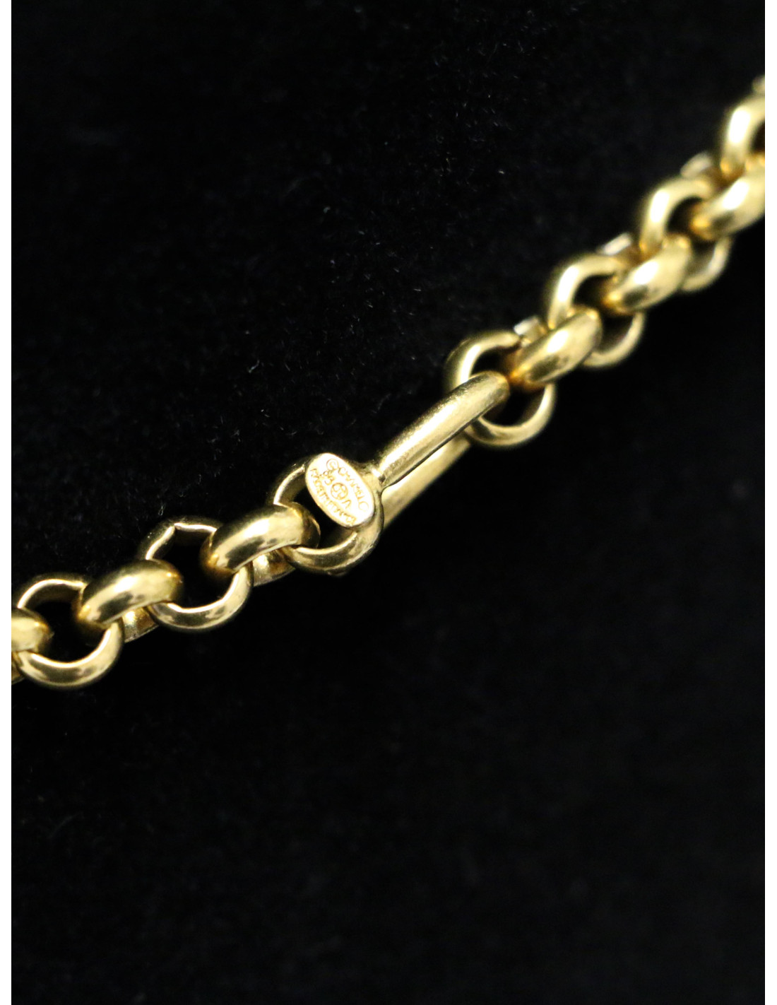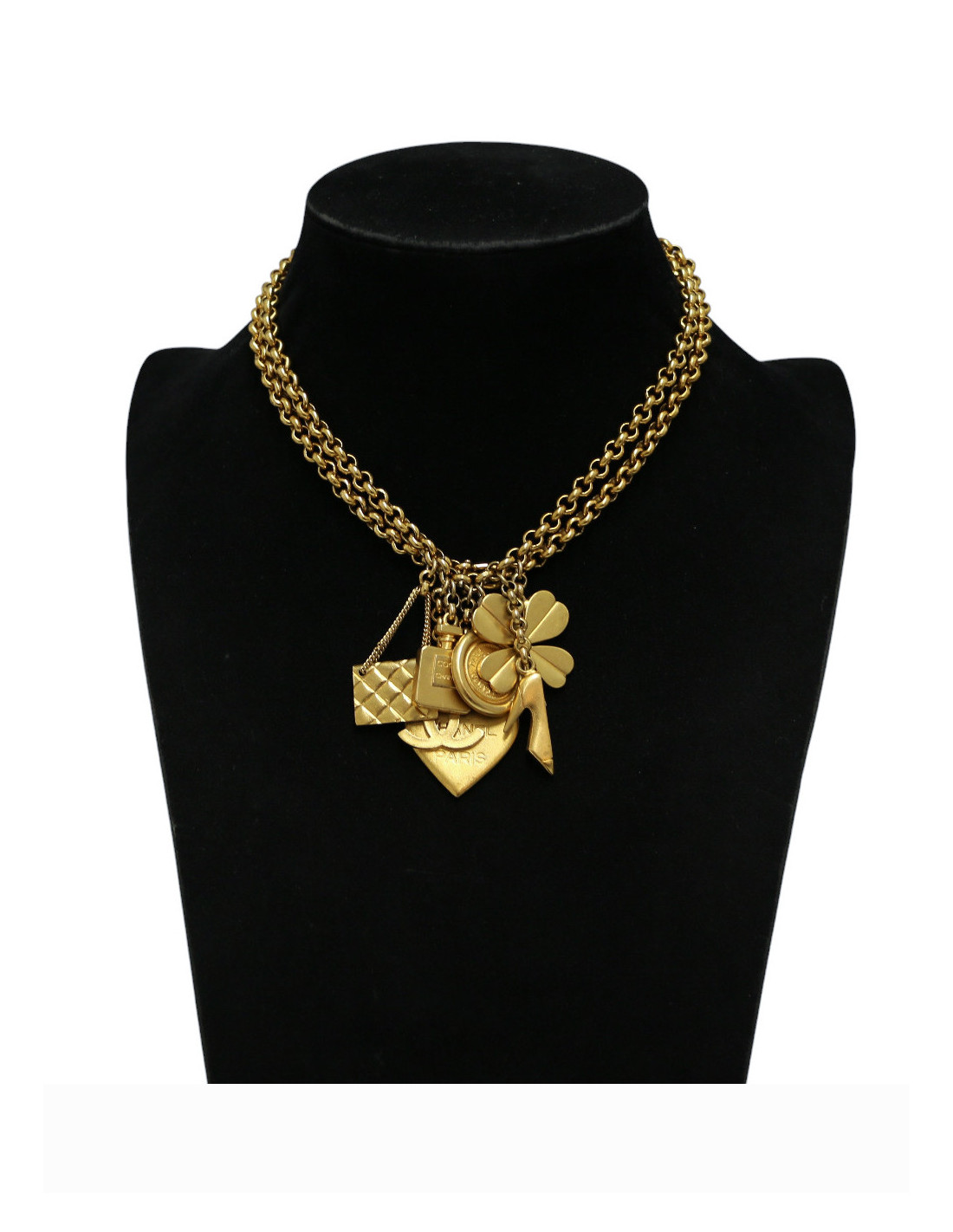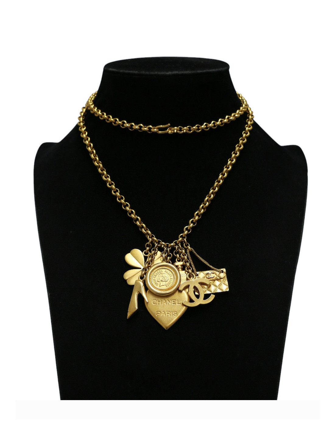 Détails : long collier vintage orné de tous les charms de la Maison de couture : le célèbre CC que l'on reconnaitrait parmi tous, le sac matelassé modèle emblématique de chez Chanel, la bouteille de parfum et l'escarpin bicolore imaginé par Gabrielle Chanel. Le médaillon rond double face gravé CC et 31 rue Cambon Paris l'adresse mythique de la Maison Française. Un coeur, autre symbole fort que la créatrice de la marque aimait intégrer également à ses collections, ainsi que le trèfle à 4 feuilles symbole porte bonheur qui lui était également cher. Aucune usure, fermeture par un crochet, possibilité de le porter long ou de doubler la chaine autour du cou.