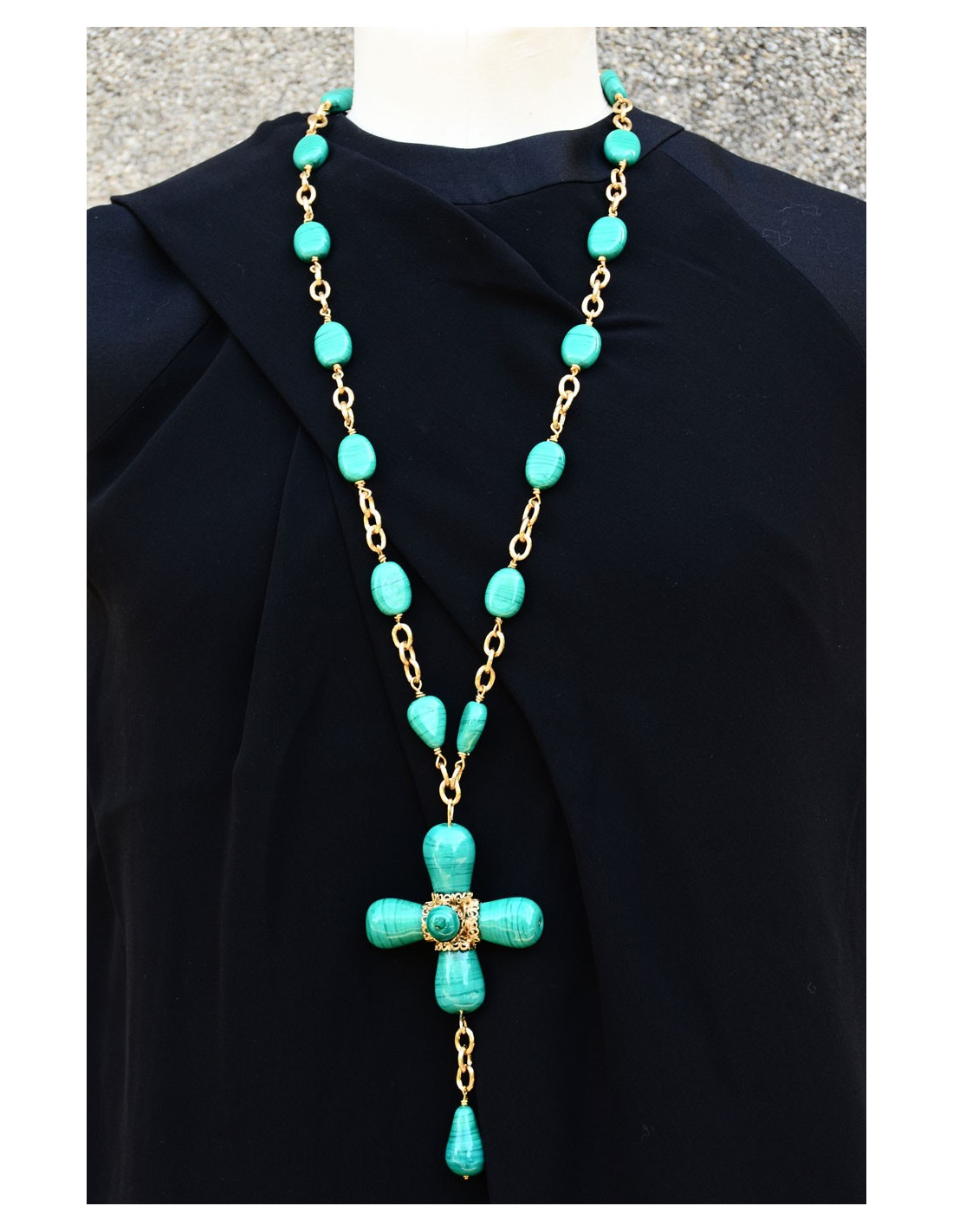 Sautoir Croix Marguerite de Valois en pâte de verre vert jade et métal doré à l'or fin.