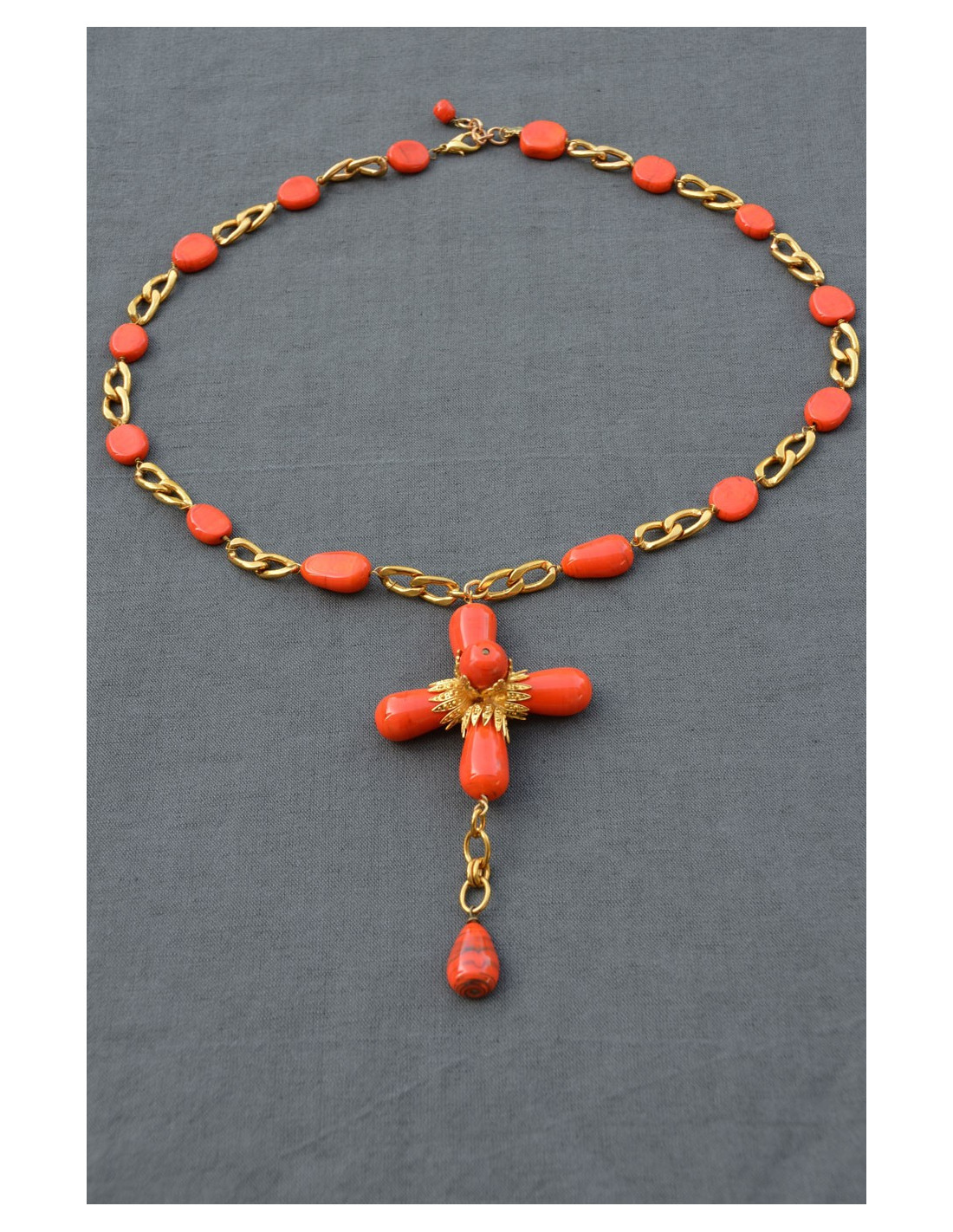 Sautoir Croix Marguerite de Valois en pâte de verre corail et métal doré à l'or fin.
