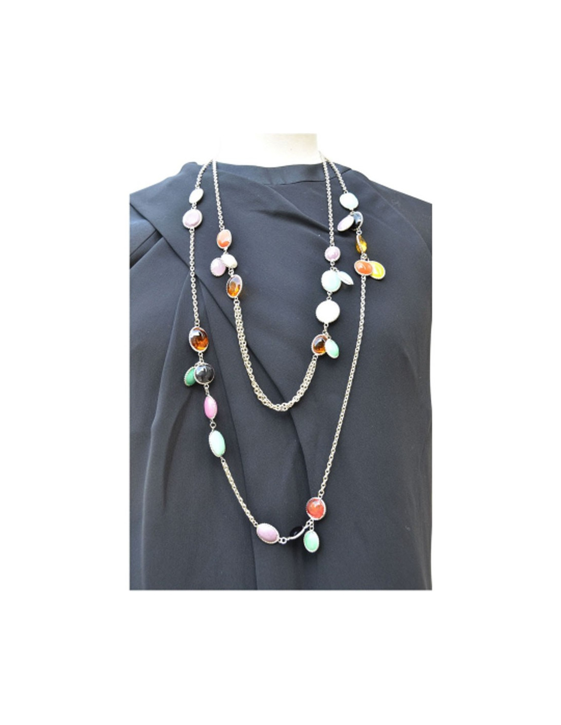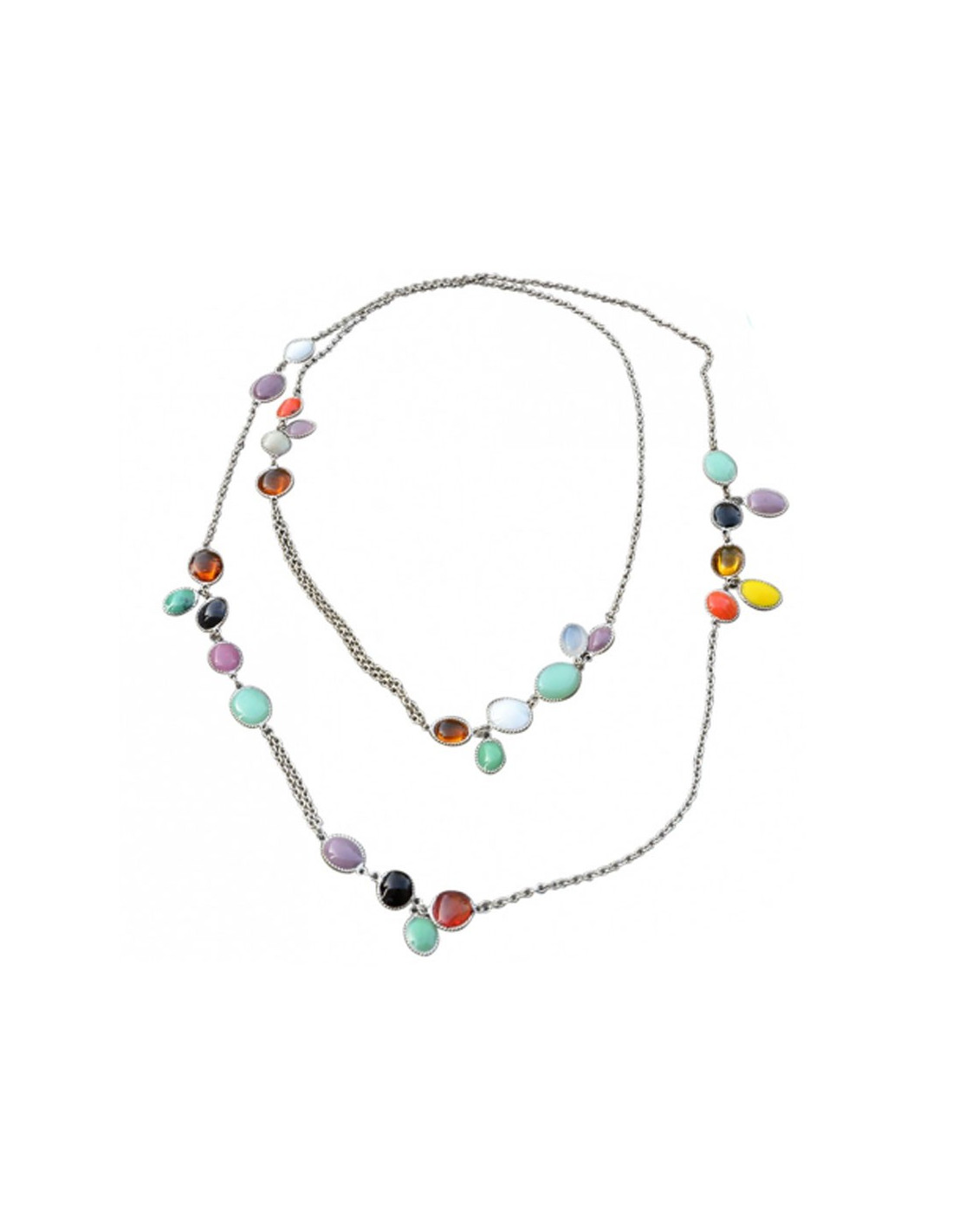 Sautoir Marguerite de Valois composé de chaines et de cabochons de pâte de verre multicolore.