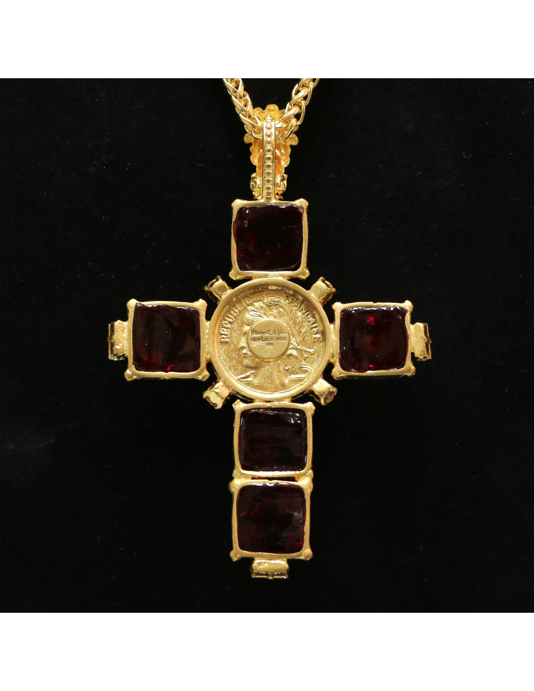 Détails : bijou fabriqué entièrement à la main en pâte de verre. Large cabochon en pâte de verre bleu au centre qui possède à l'intérieur un blason avec des fleurs de lys.