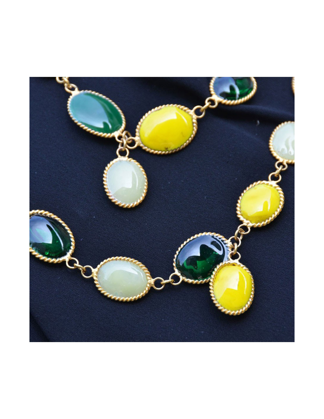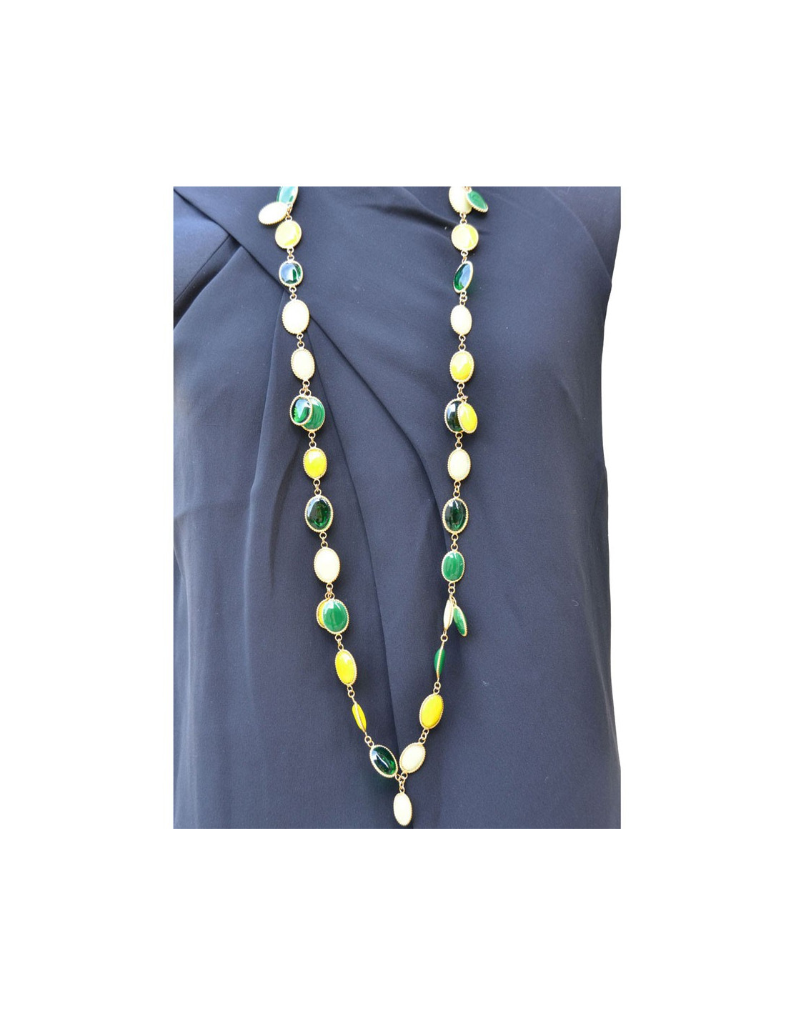 Détails : sautoir en cabochons de pâte de verre jaune, jaune pâle et émeraude, monté sur métal doré