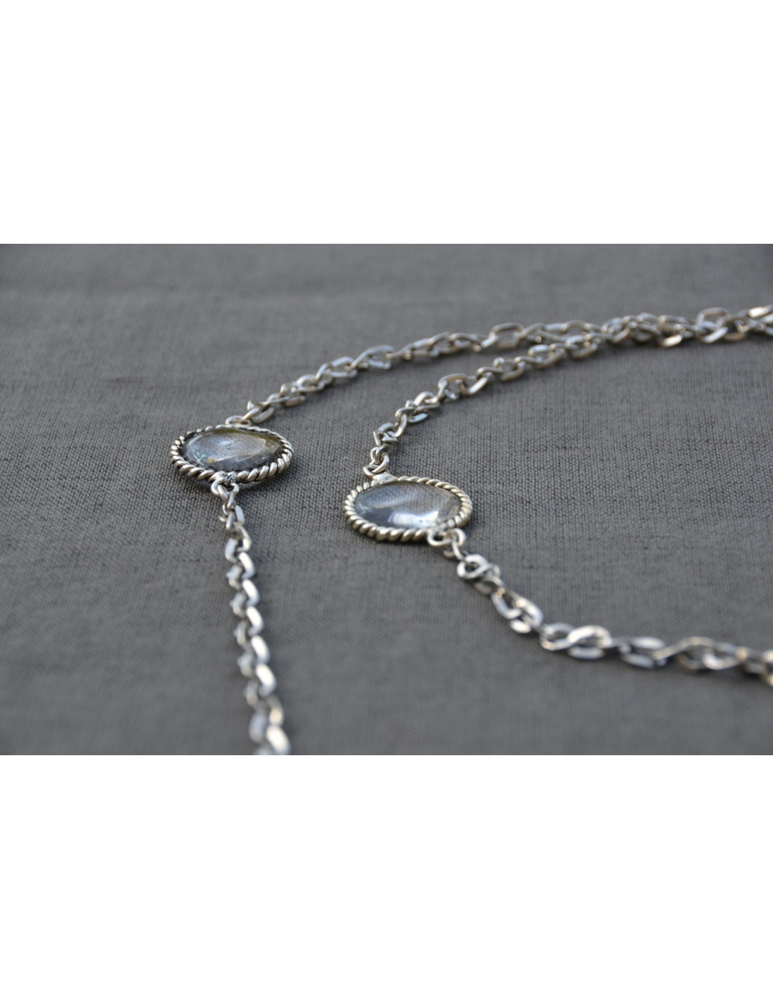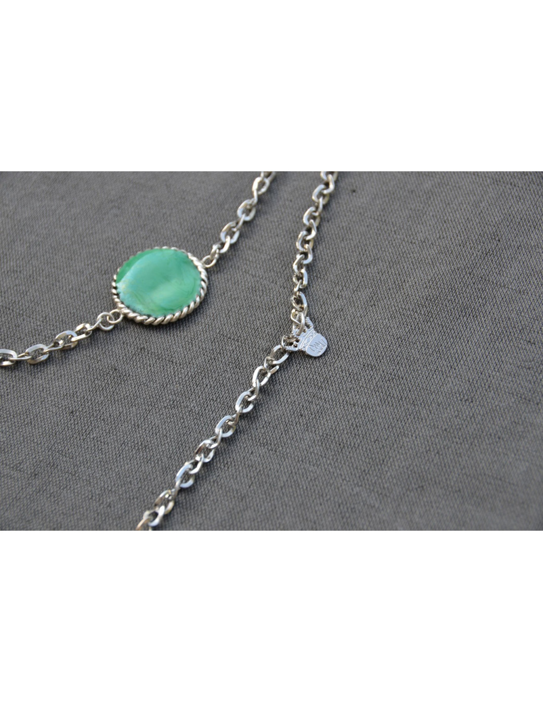 Sautoir Marguerite de Valois pâte de verre transparente et vert jade, chaine en métal argenté.